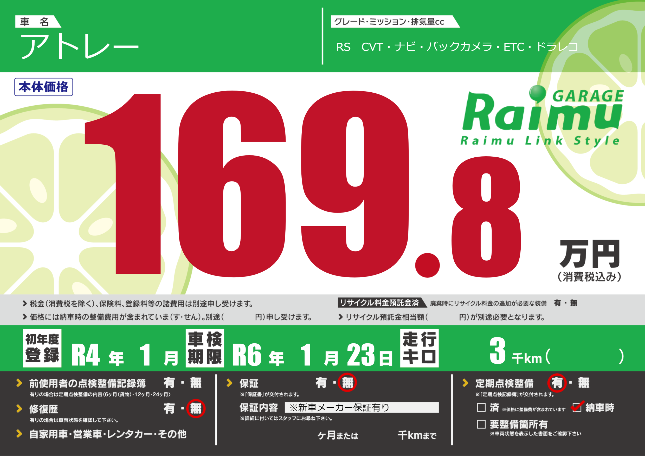 | 走行キロ | 0.3万km | 初年度登録 | R4年1月 |