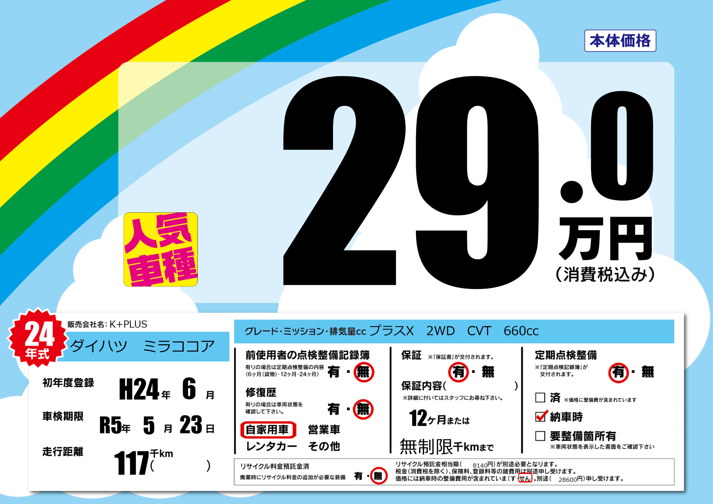 | 車名 | ダイハツ ミラココア | グレード ミッション 排気量 |