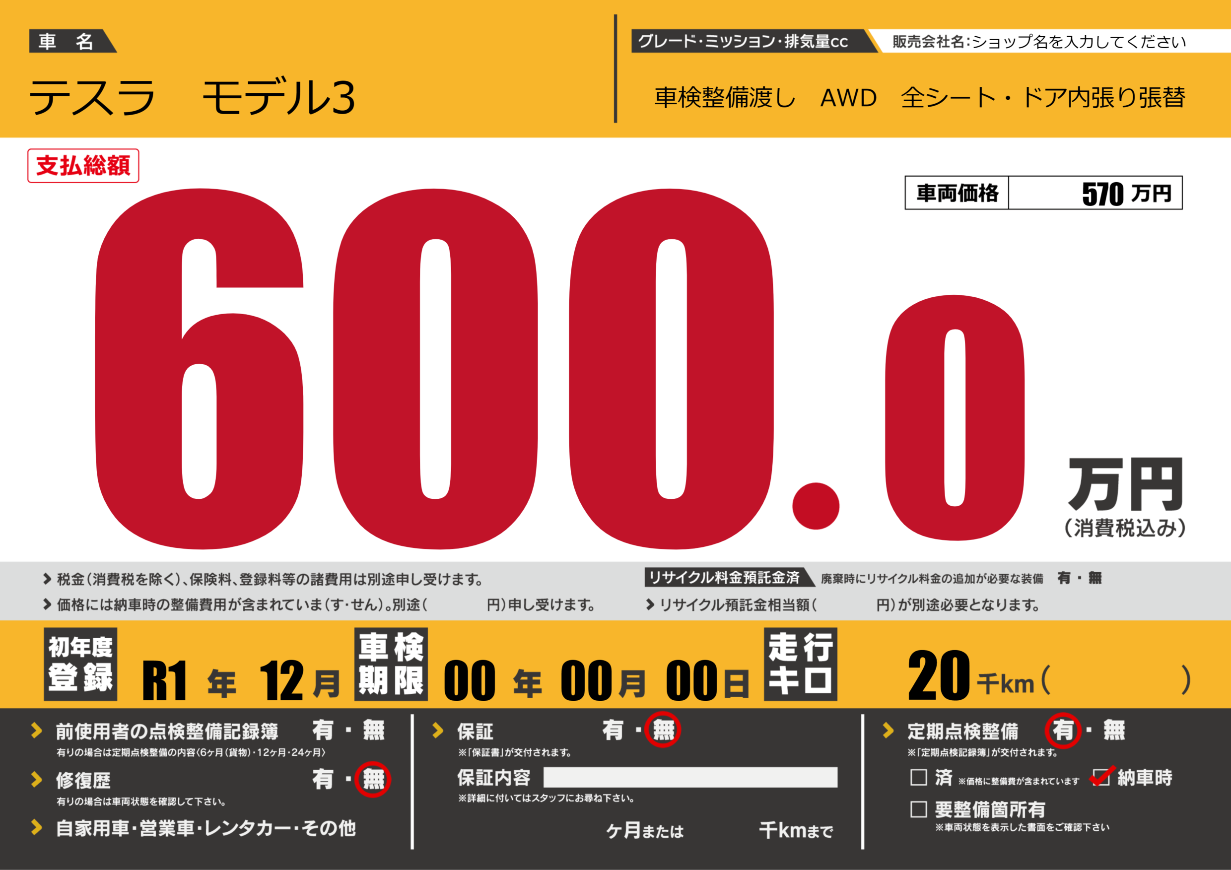 | 車検制限 | 00年 00月 00日 | ||
