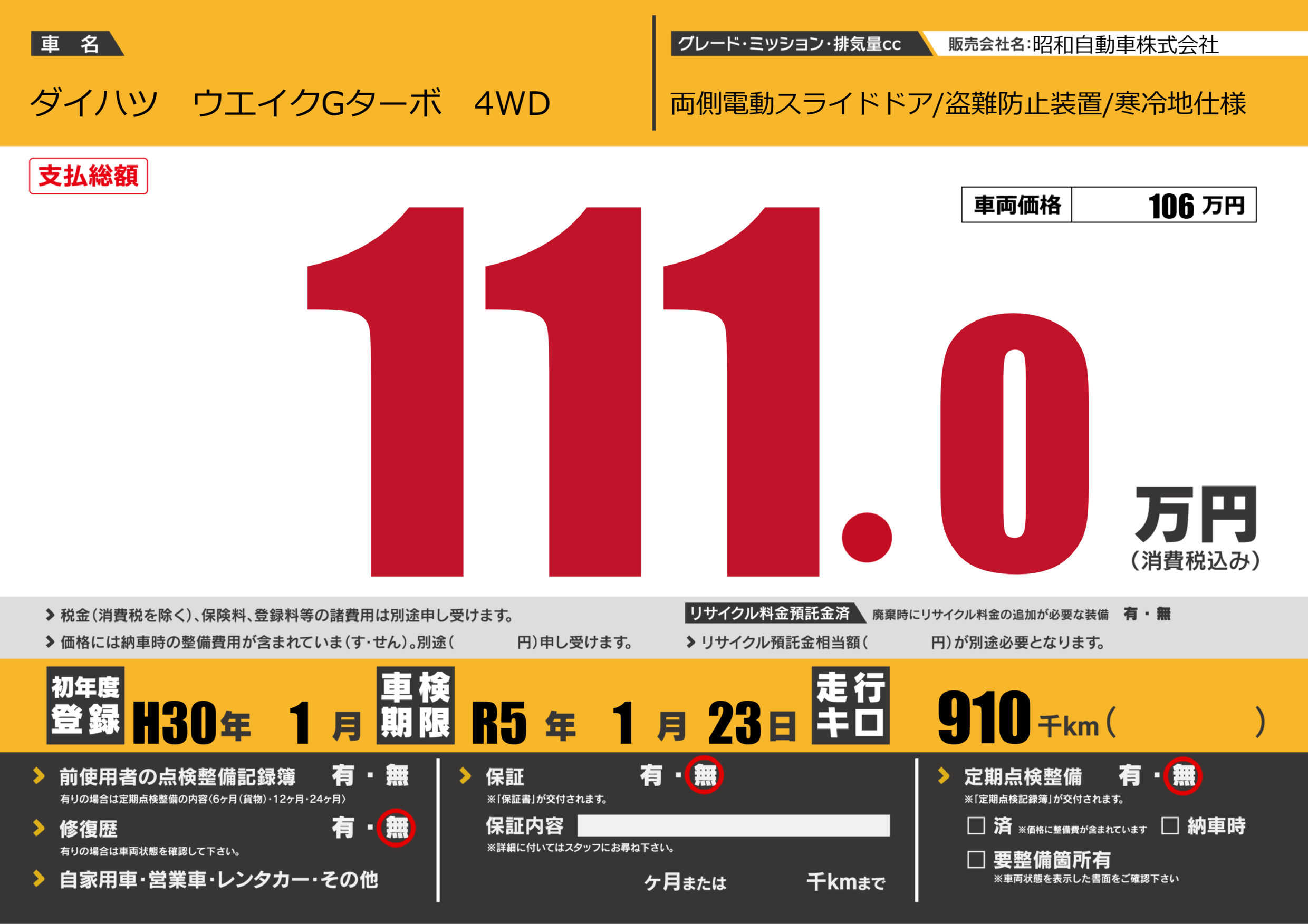| 車名 | ダイハツ ウエイクGターボ 4WD | グレード ミッション 排気量 |