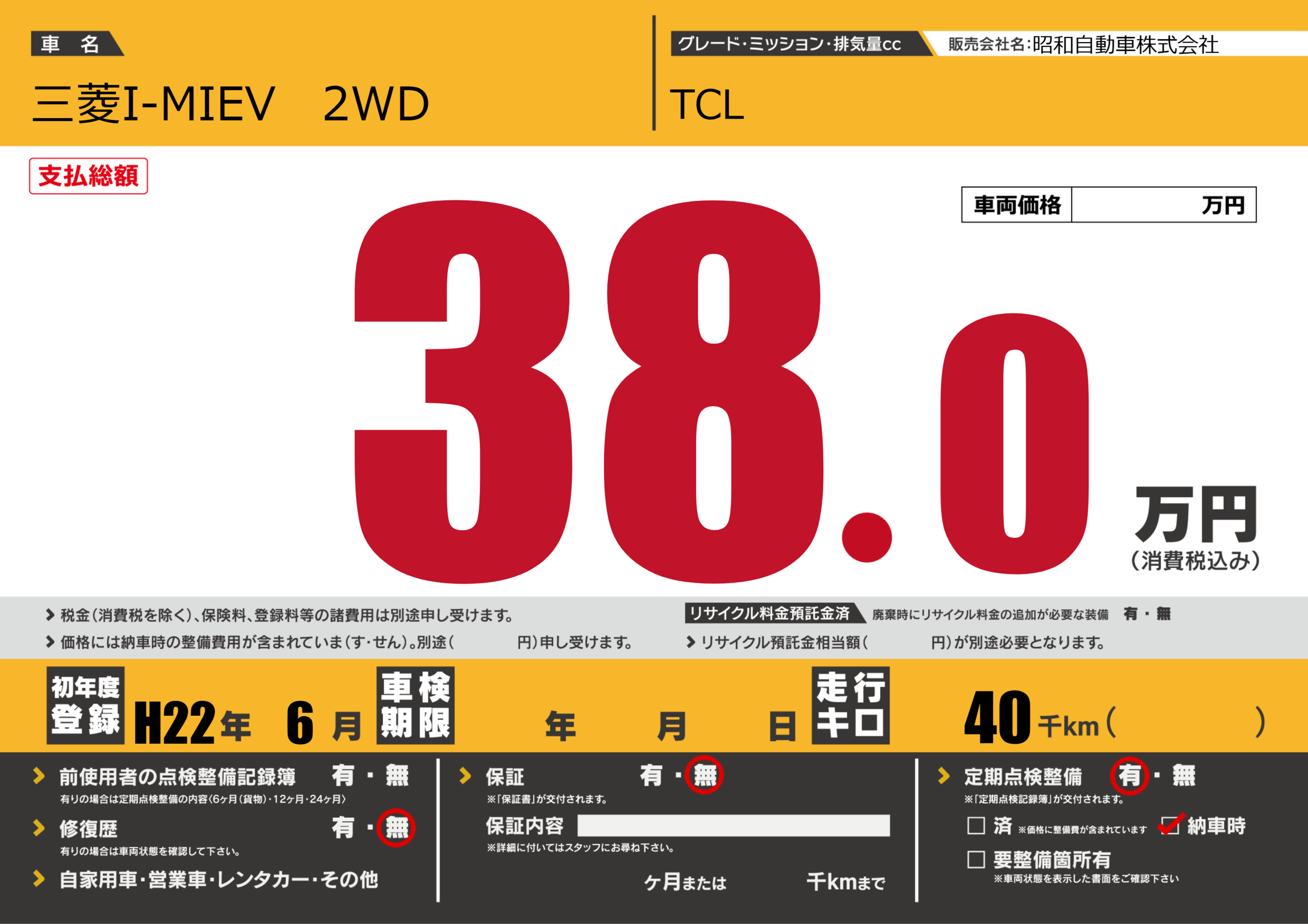 | 定期点検整備 | 定期点検整備あり 納車時あり | ||