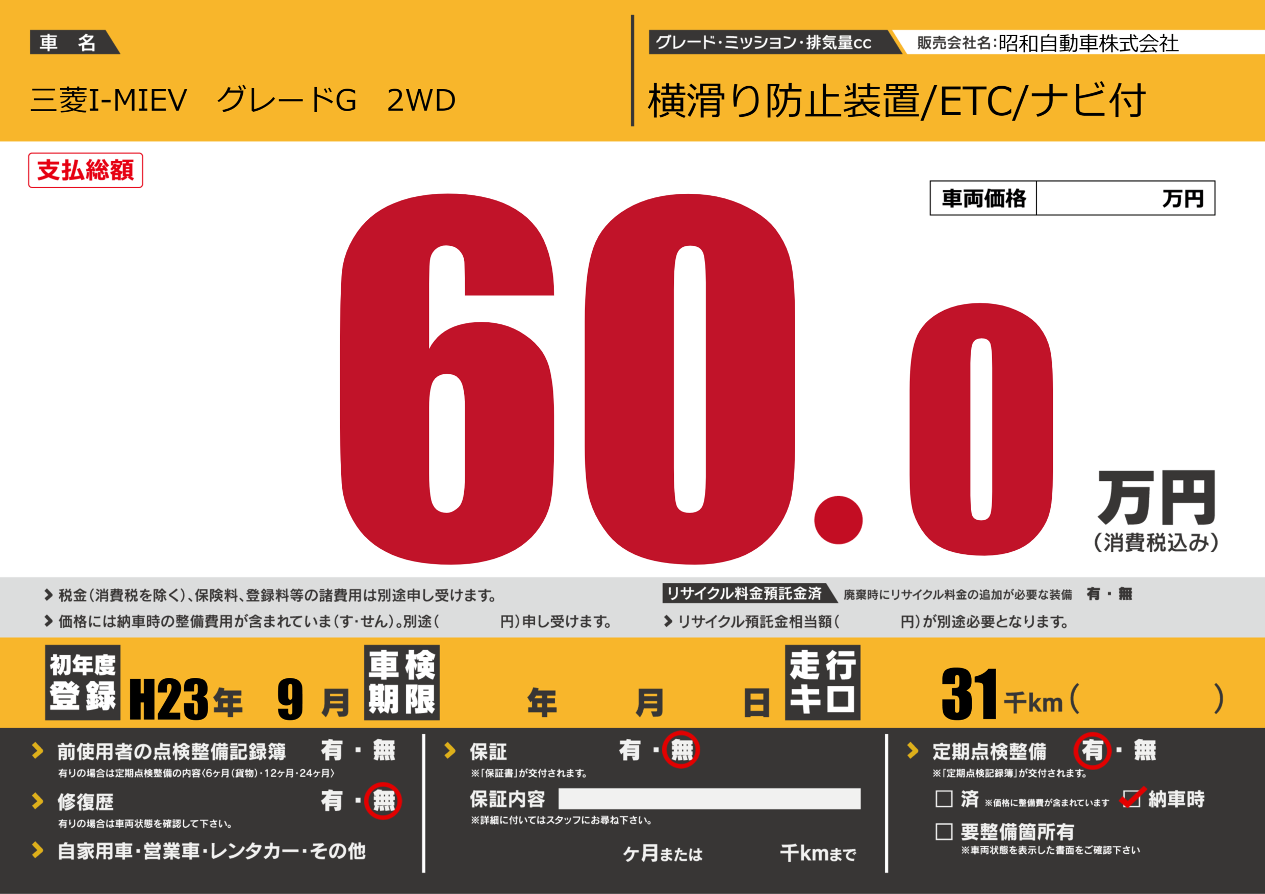 | 走行キロ | 3.1万km | 初年度登録 | H23年9月 |