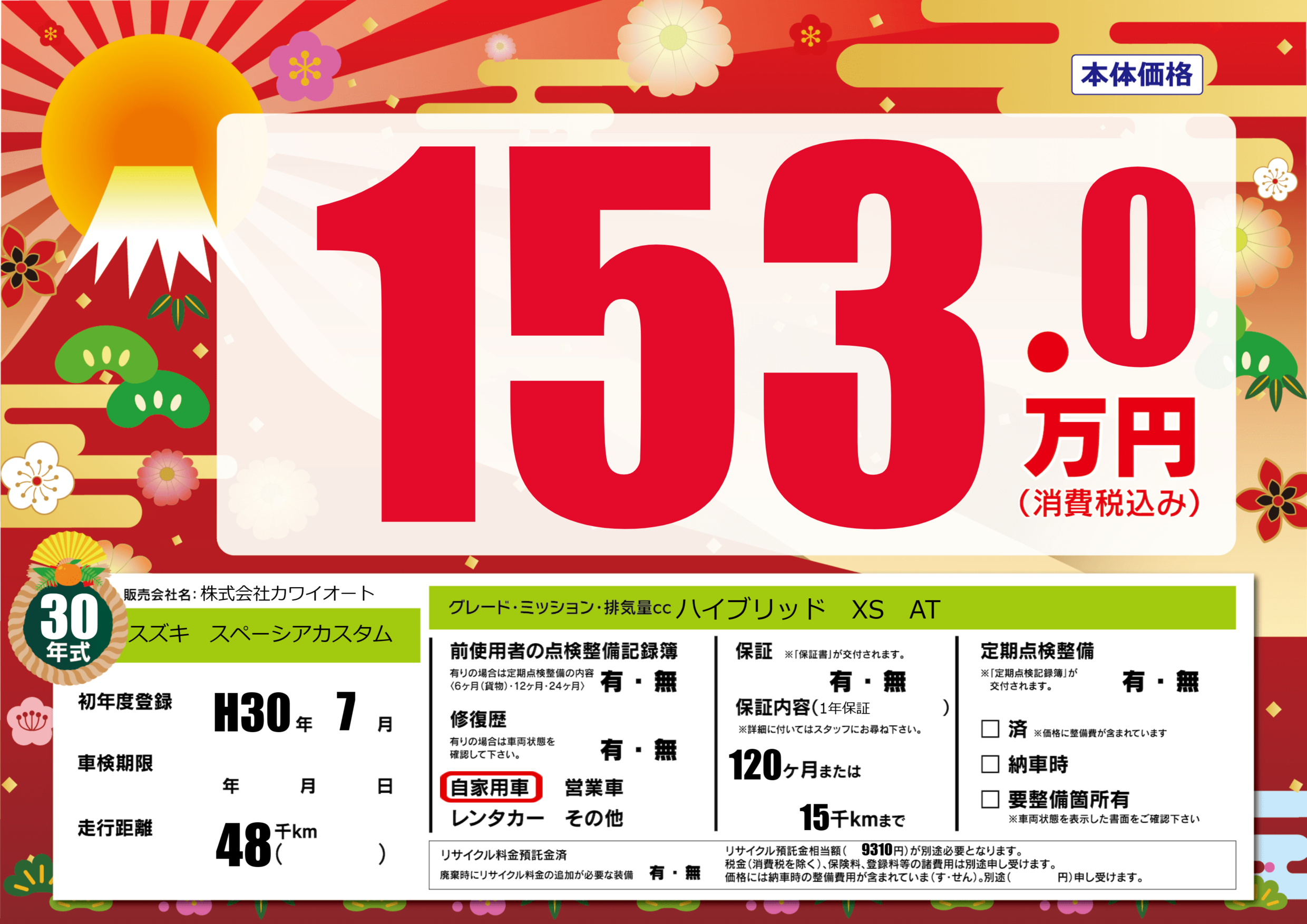 | 走行キロ | 4.8万km | 初年度登録 | H30年7月 |