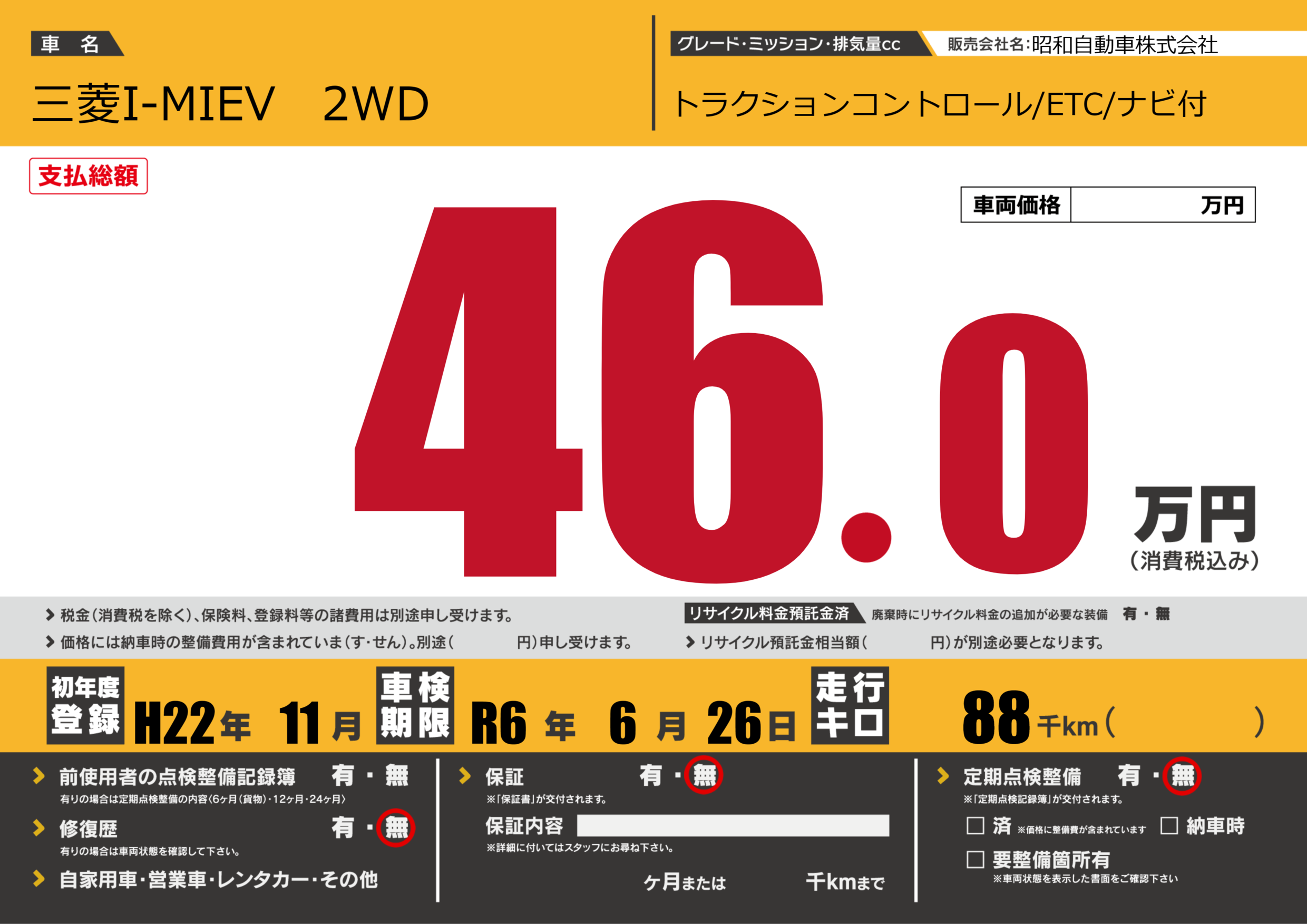 | 車名 | 三菱I-MIEV 2WD | グレード ミッション 排気量 |