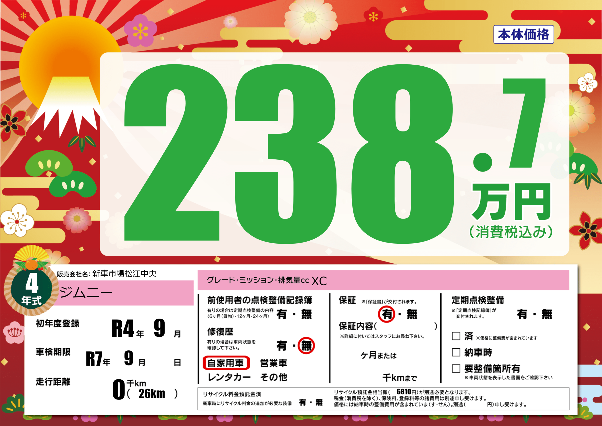 | 車名 | ジムニー | グレード ミッション 排気量 |