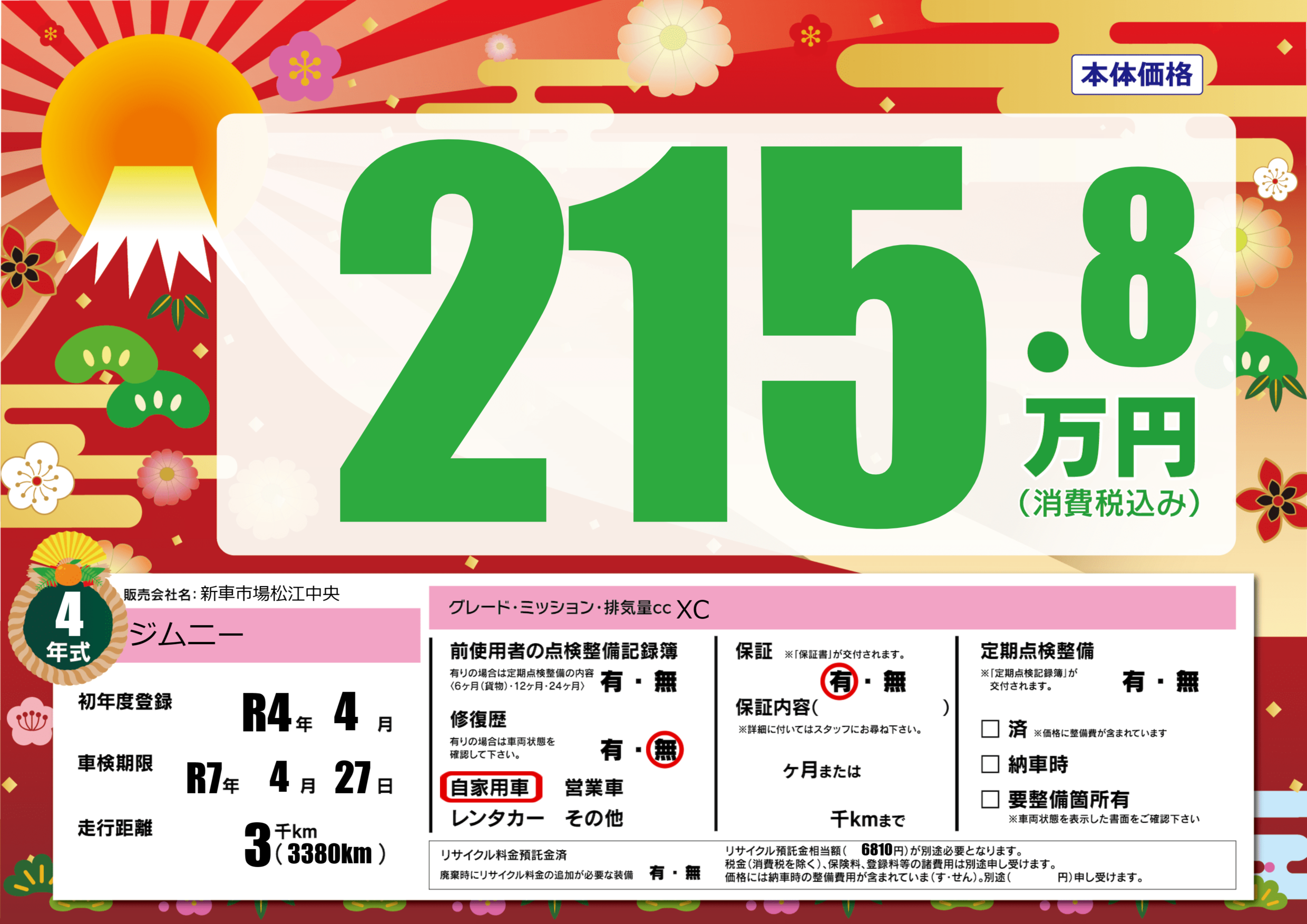 | 車名 | ジムニー | グレード ミッション 排気量 |