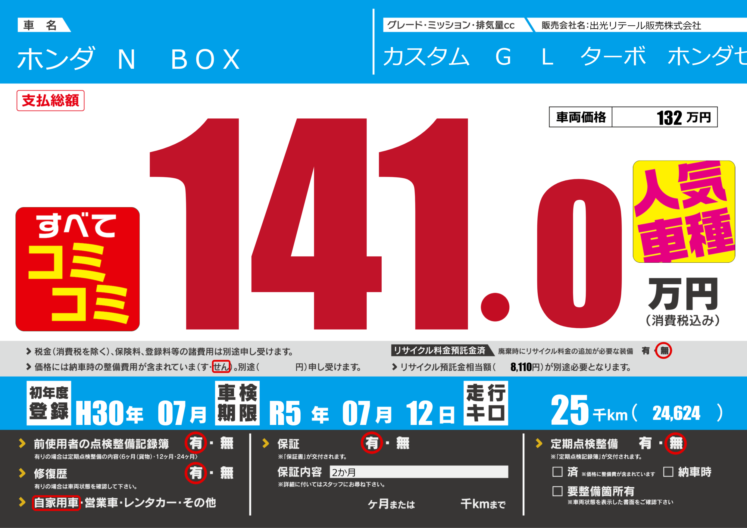 保証付き 保証内容(2か月) ---ヶ月または()千kmまで |