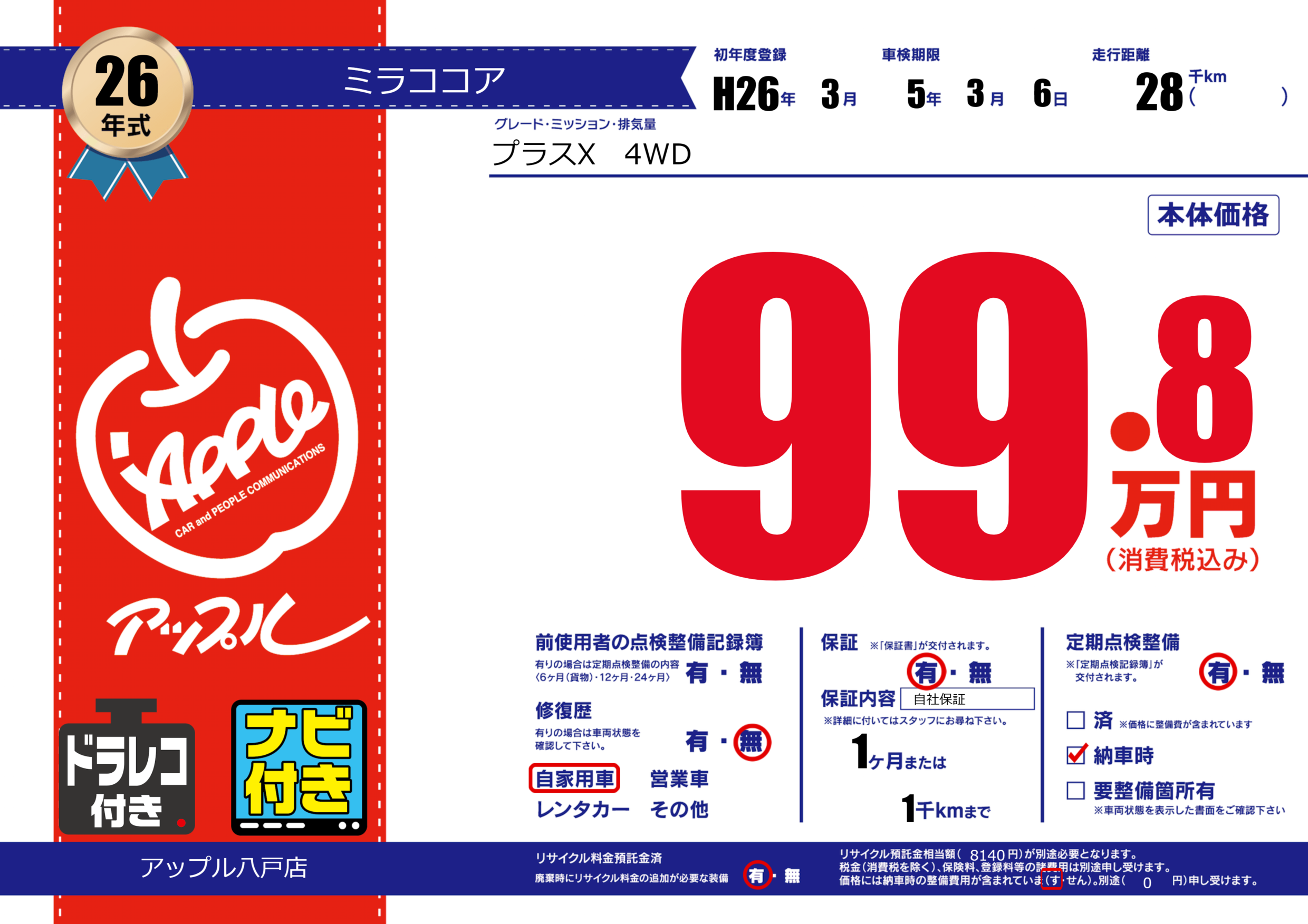 | 走行キロ | 2.8万km | 初年度登録 | H26年3月 |
