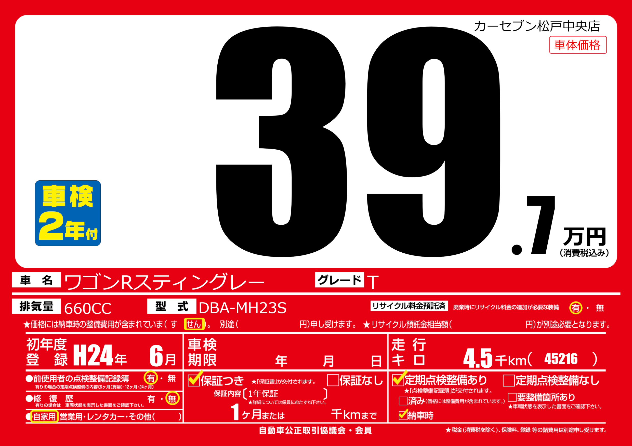| 走行キロ | 0.4万km | 初年度登録 | H24年6月 |