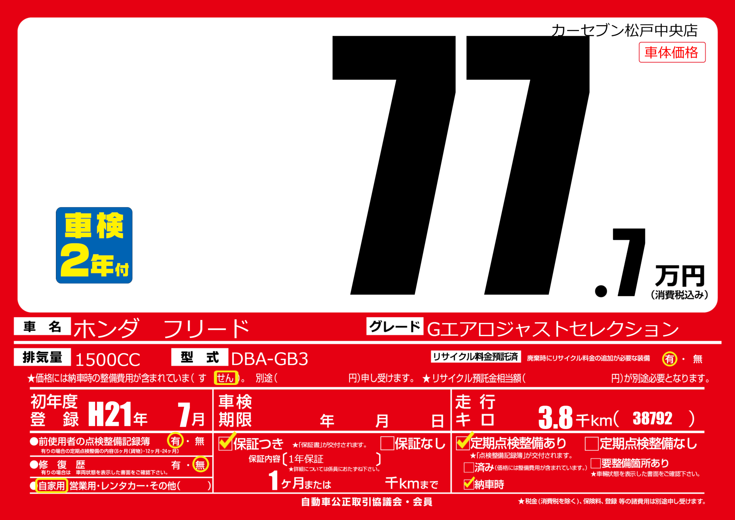 | 車名 | ホンダ フリード | グレード ミッション 排気量 |