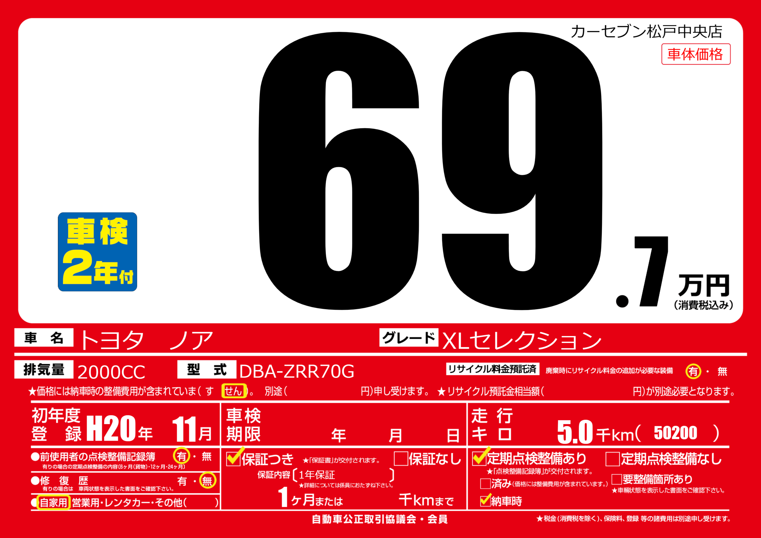 | 車名 | トヨタ ノア | グレード ミッション 排気量 |