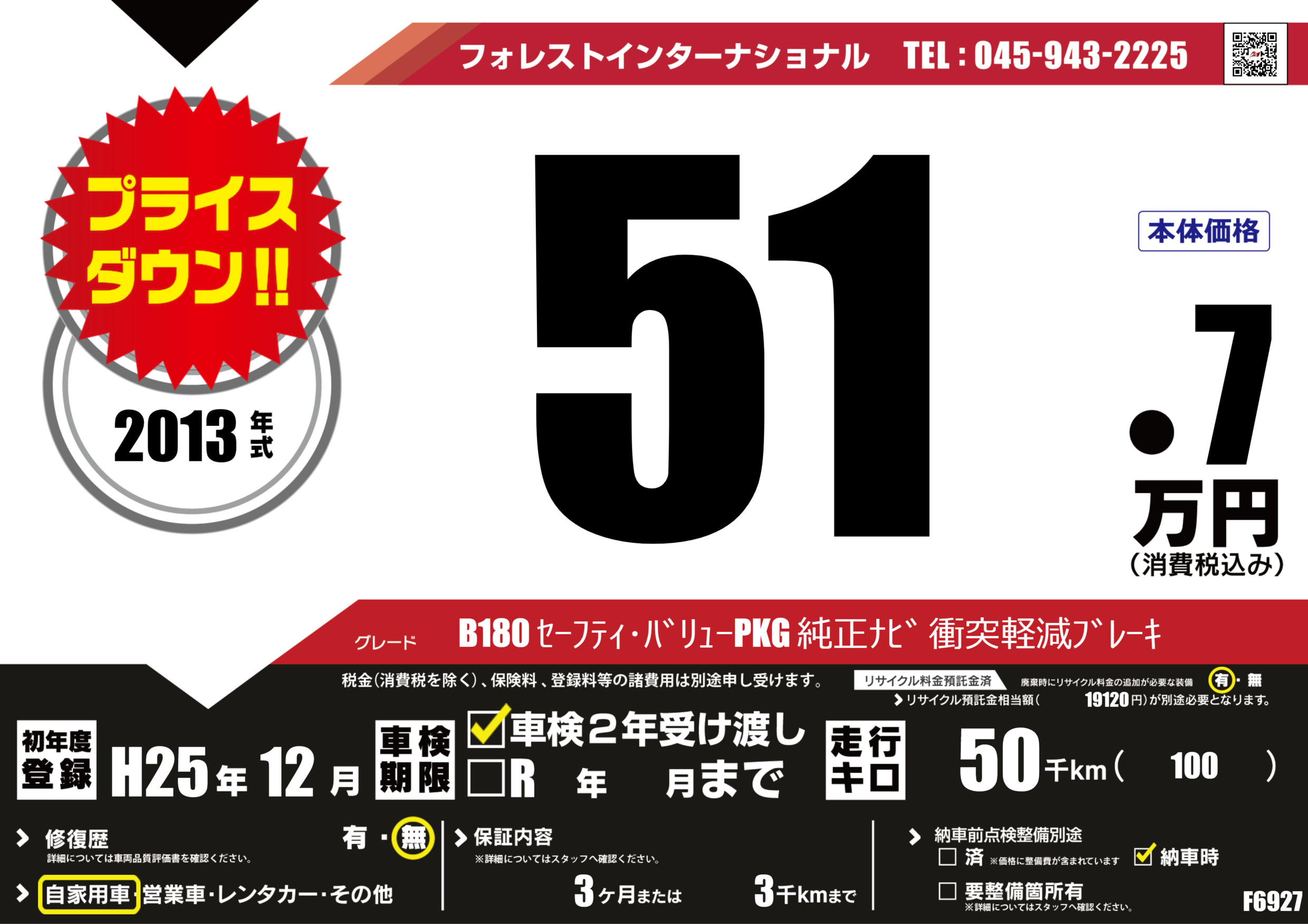| 走行キロ | 5万km | 初年度登録 | H25年12月 |