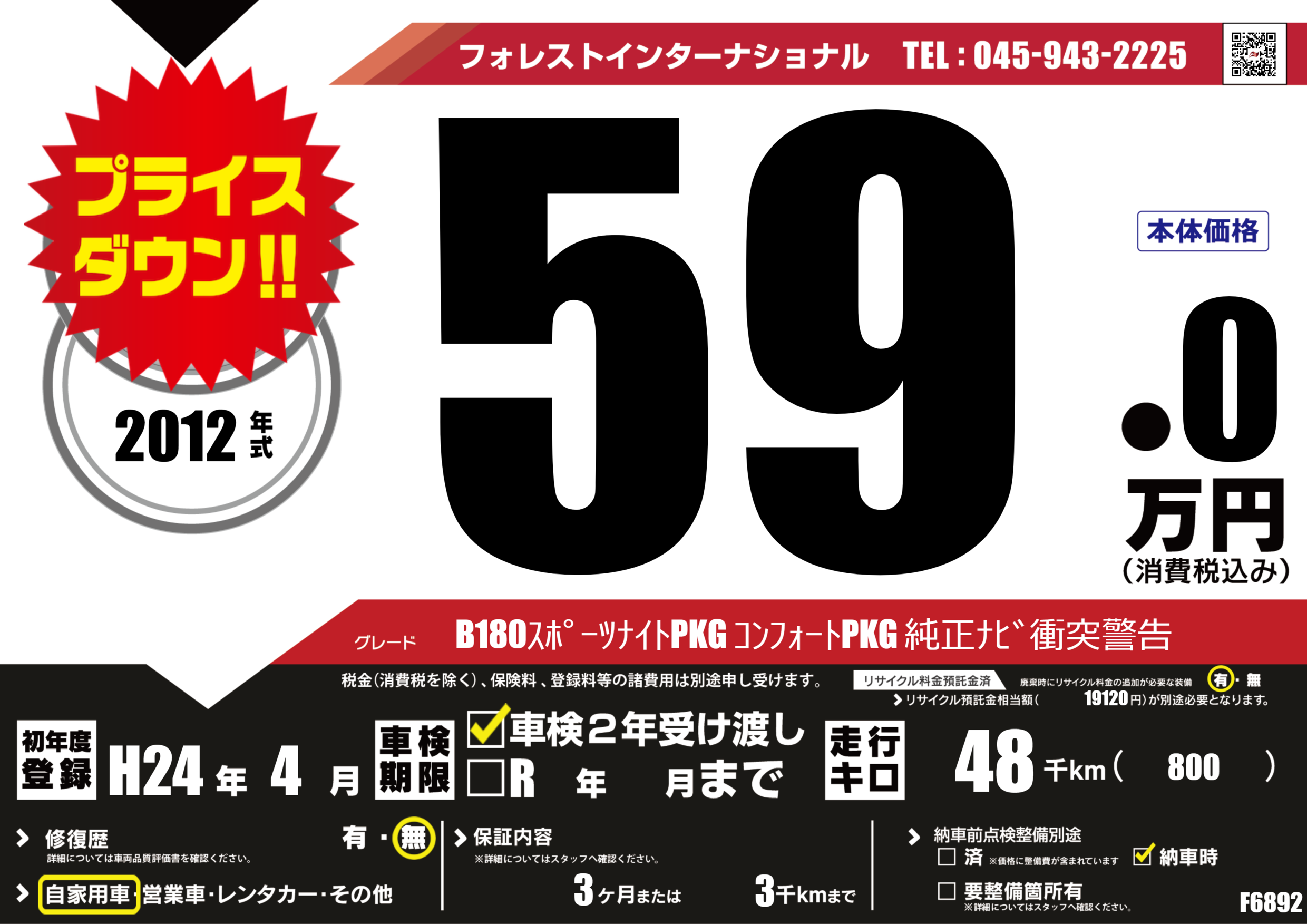 B180スポーツナイトPKG コンフォートPKG 純正ナビ衝突警告 |