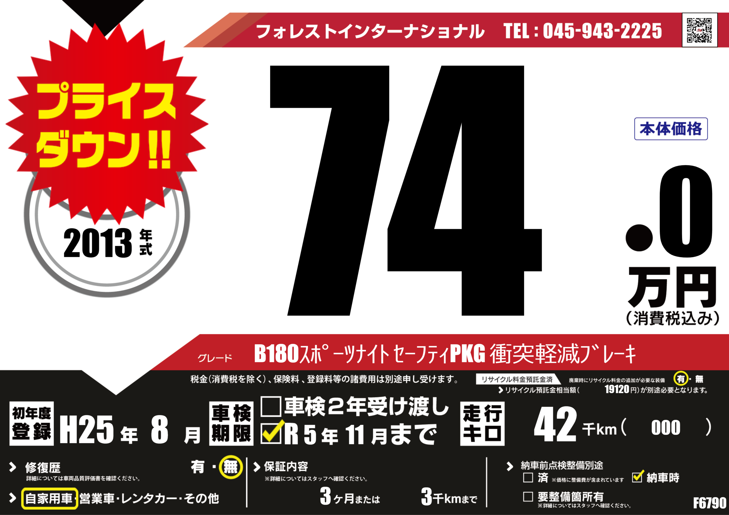B180スポーツナイト セーフティPKG 衝突軽減ブレーキ |