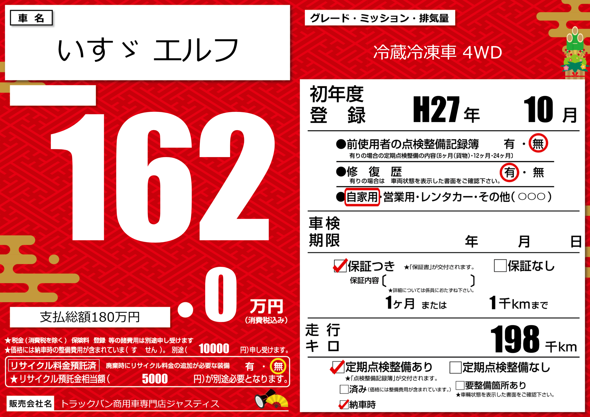 | 走行キロ | 19.8万km | 初年度登録 | H27年10月 |