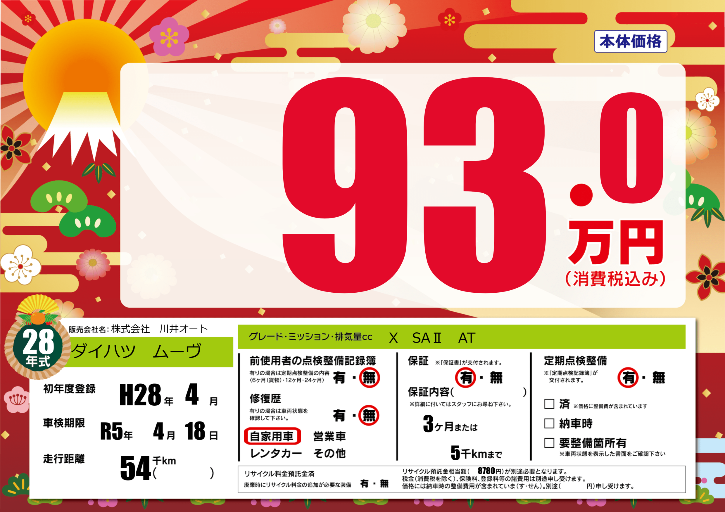 | 走行キロ | 5.4万km | 初年度登録 | H28年4月 |