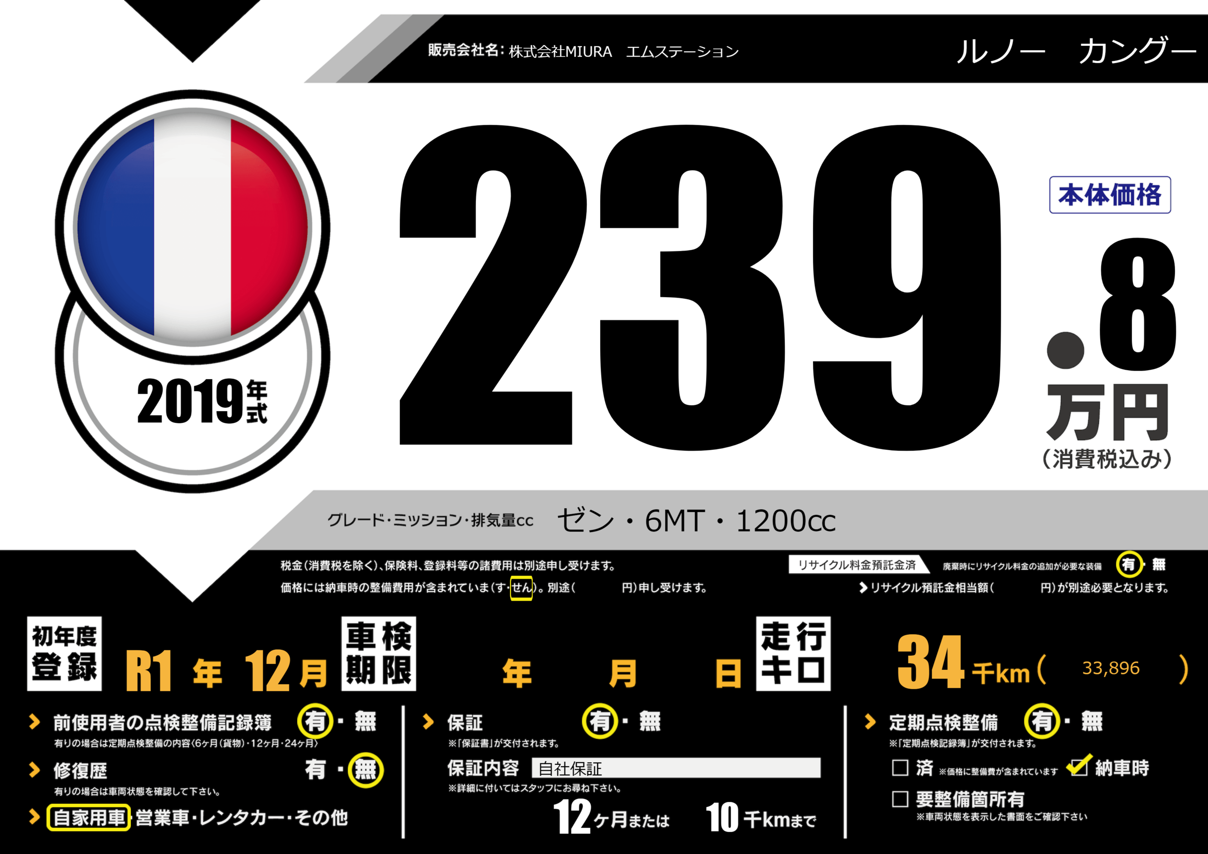 | 走行キロ | 3.4万km | 初年度登録 | R1年12月 |