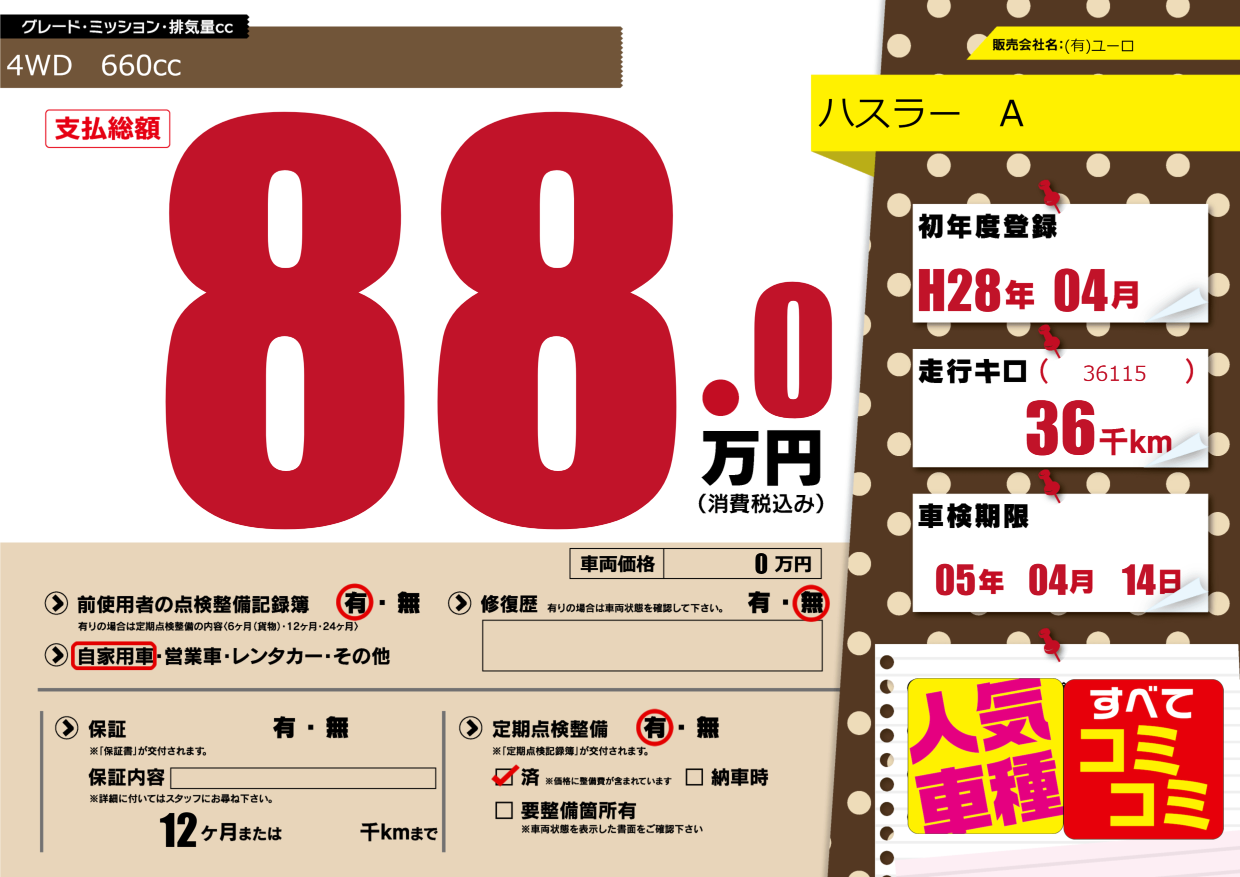 | 車名 | ハスラー A | グレード ミッション 排気量 |