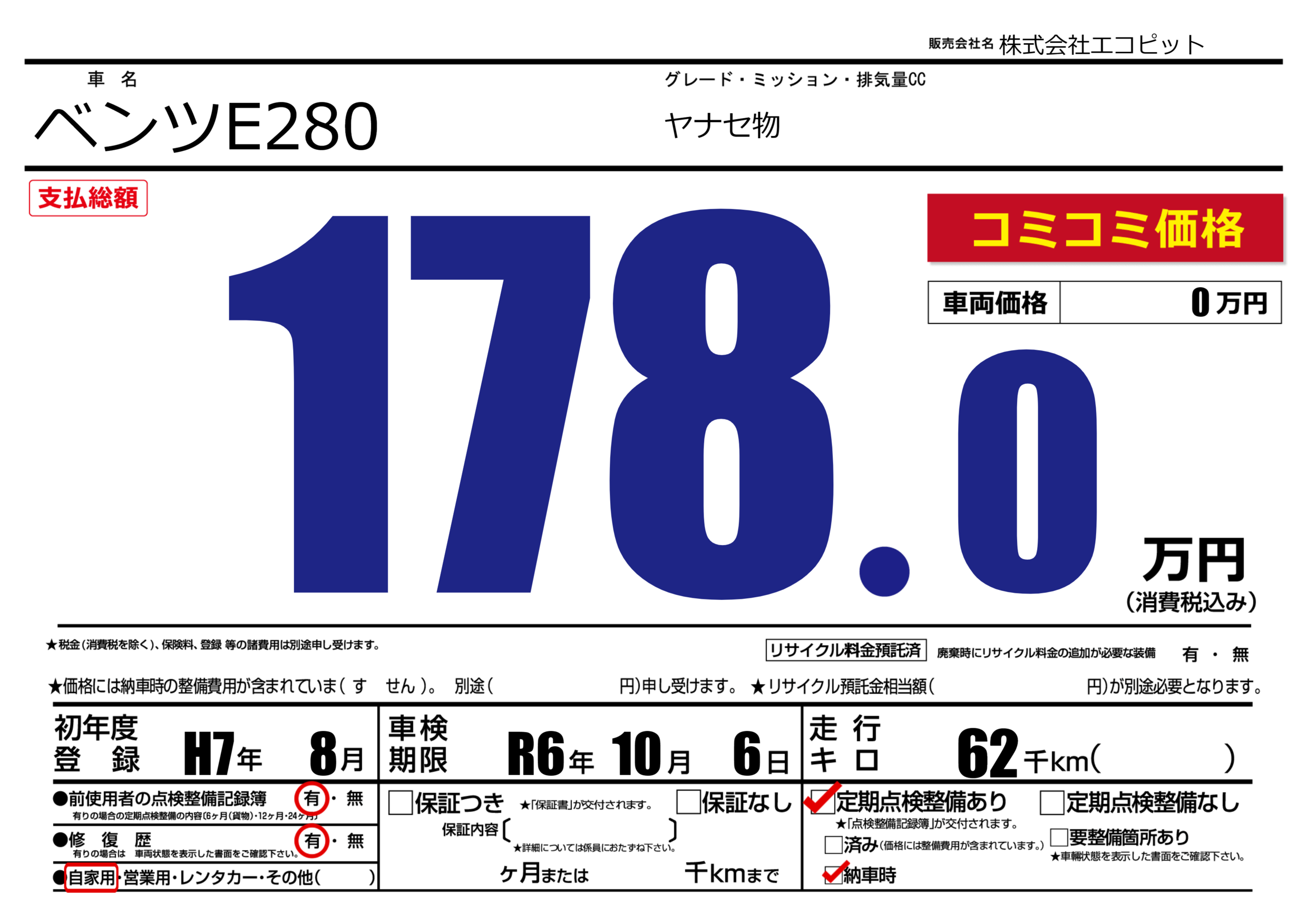 | 車名 | ベンツE280 | グレード ミッション 排気量 |