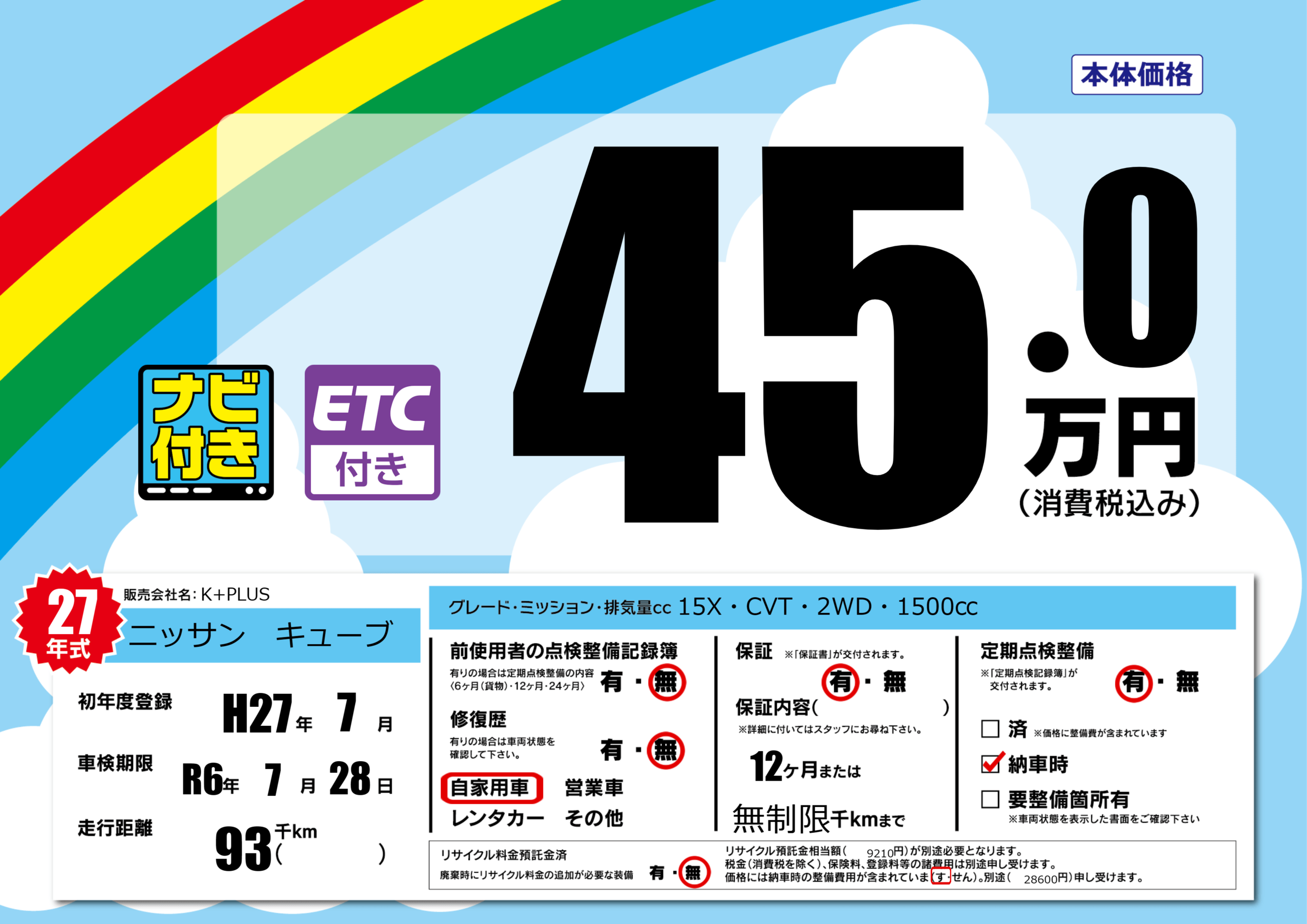 | 定期点検整備 | 定期点検整備あり 納車時あり | ||