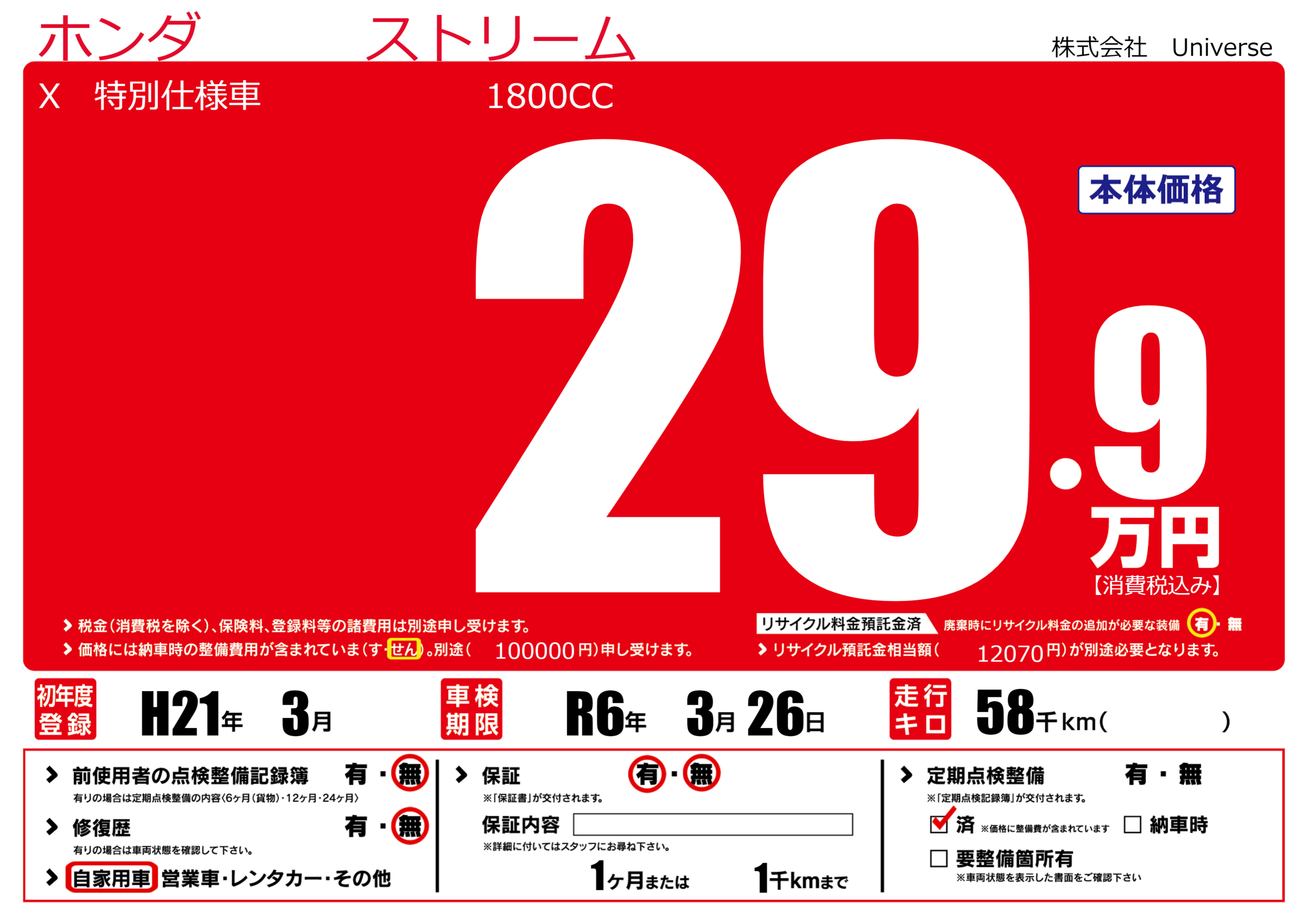 | 車名 | ホンダ ストリーム | グレード ミッション 排気量 |
