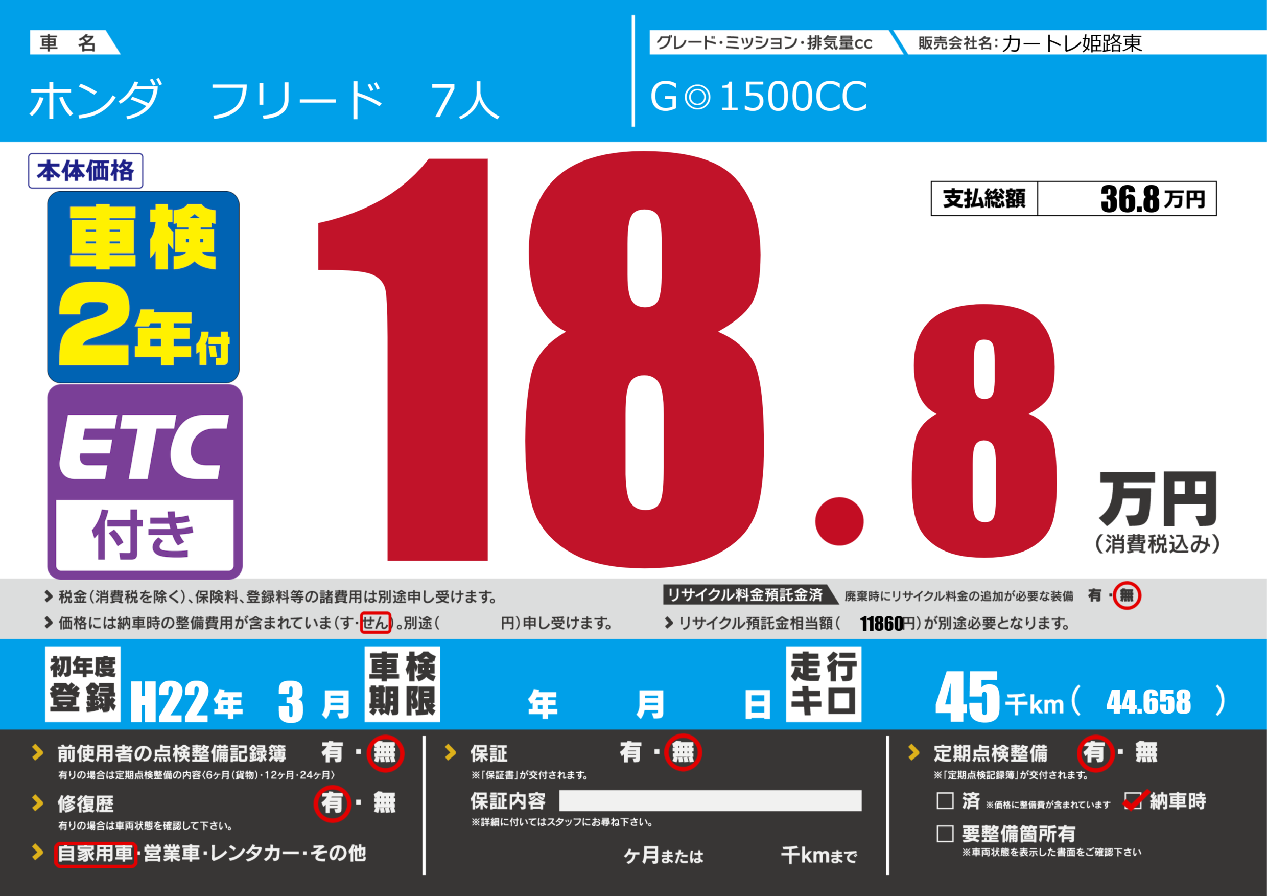 | 車名 | ホンダ フリード 7人 | グレード ミッション 排気量 |