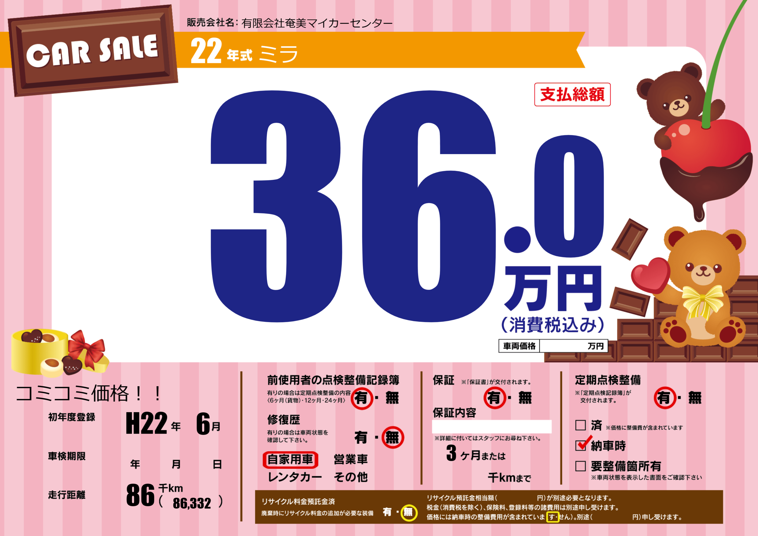 | 走行キロ | 8.6万km | 初年度登録 | H22年6月 |