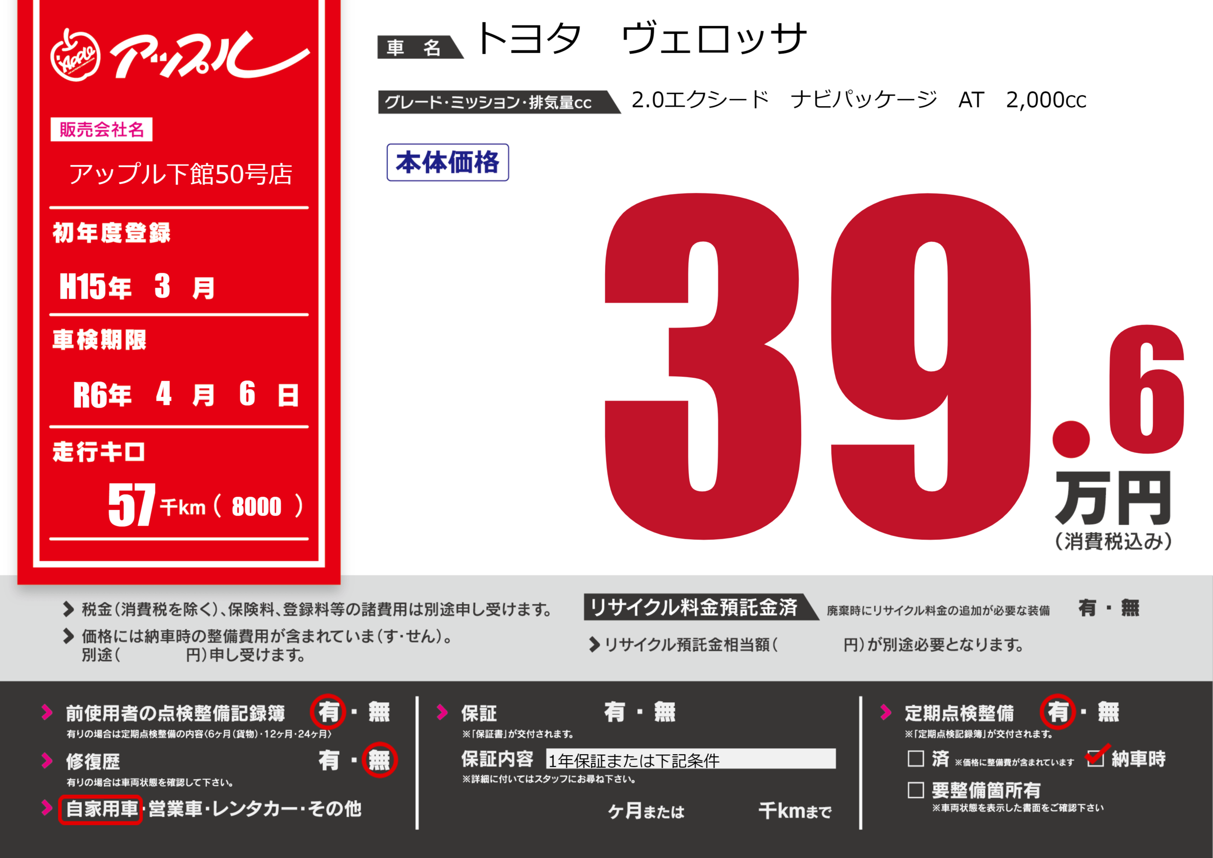 | 走行キロ | 5.7万km | 初年度登録 | H15年3月 |