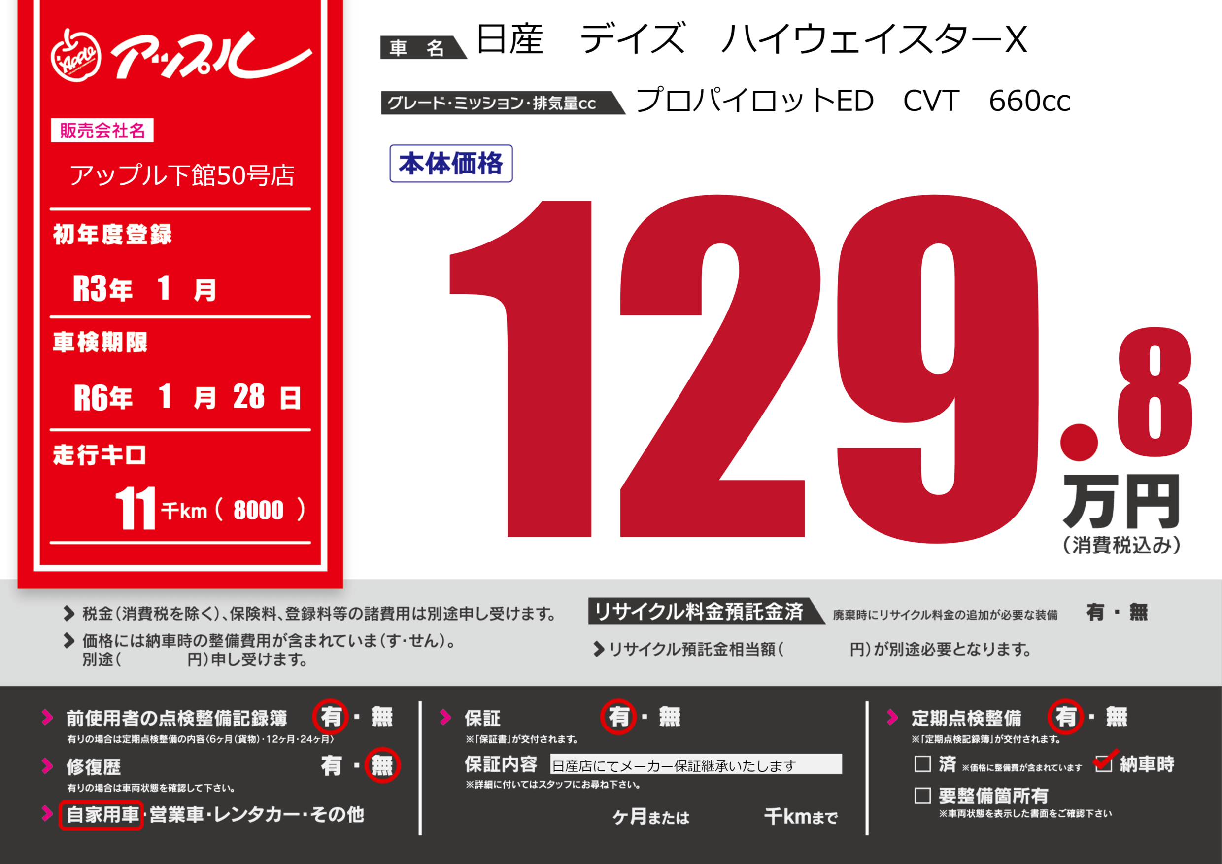 | 車名 | 日産 デイズ ハイウェイスターX | グレード ミッション 排気量 |