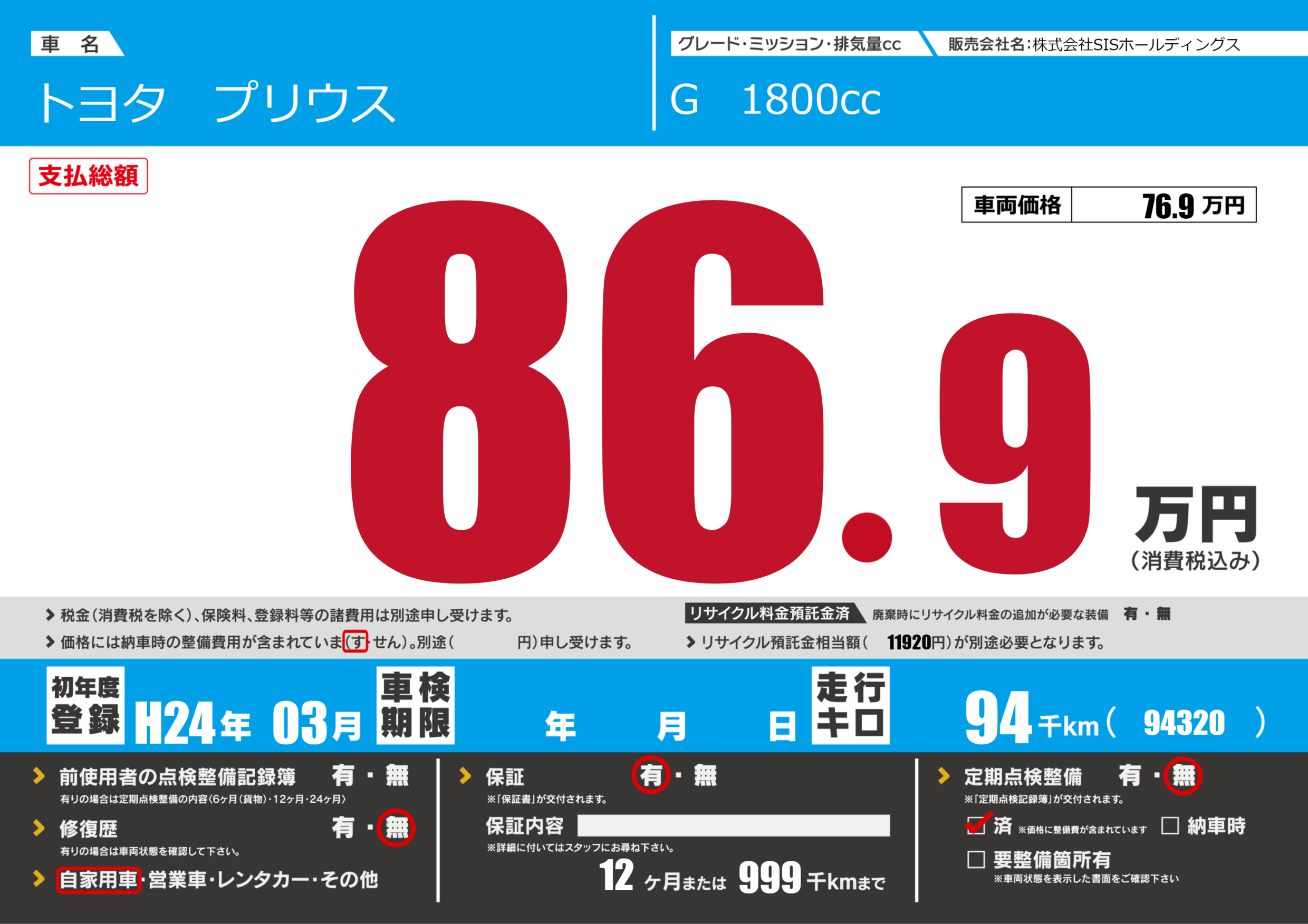 保証付き 保証内容(---) 12ヶ月または(999)千kmまで |
