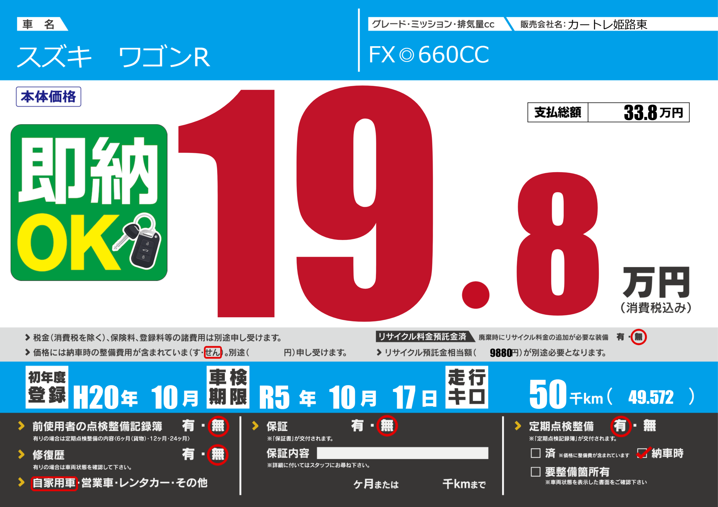 | 走行キロ | 5万km | 初年度登録 | H20年10月 |