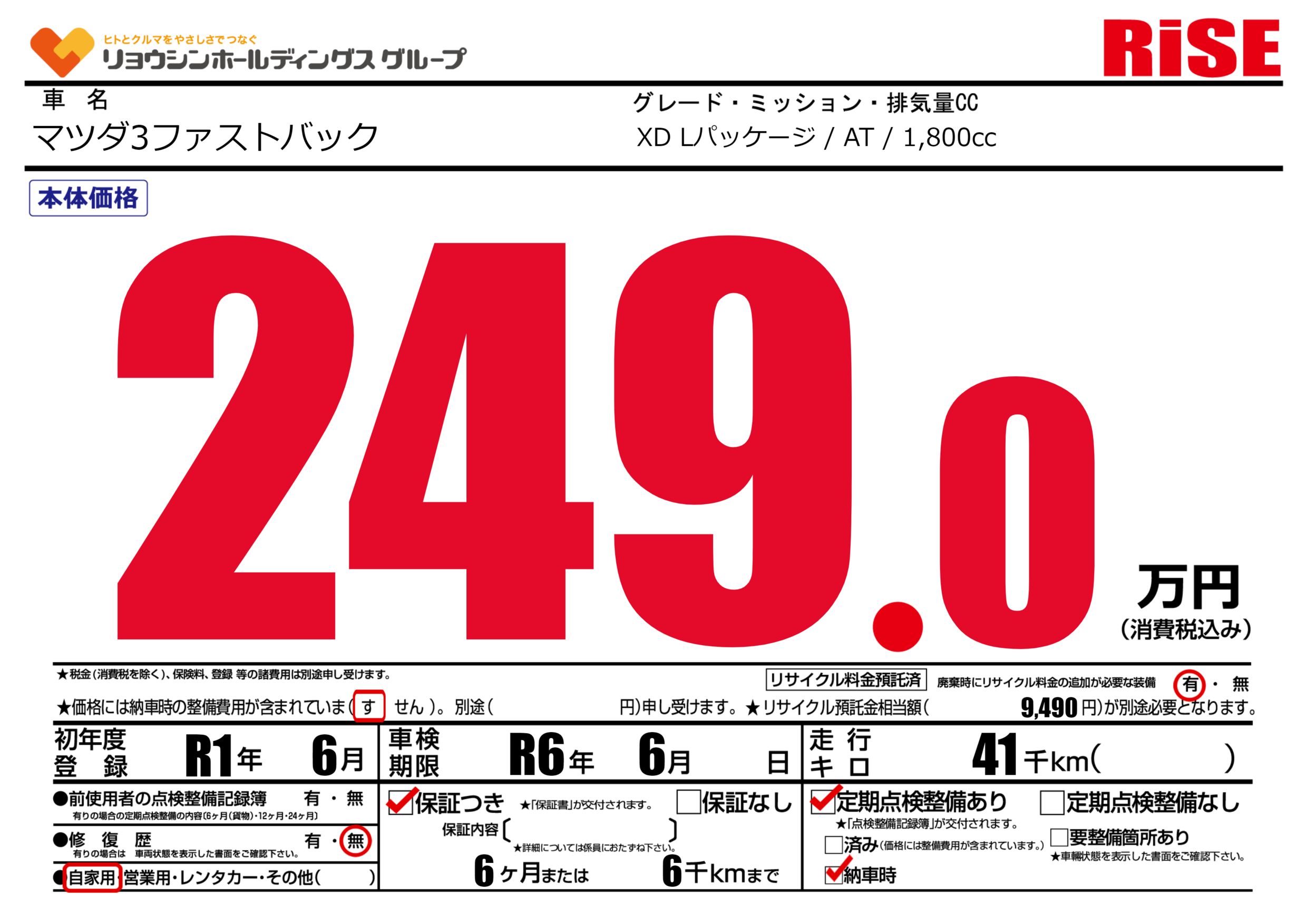 | 車名 | マツダ3ファストバック | グレード ミッション 排気量 |