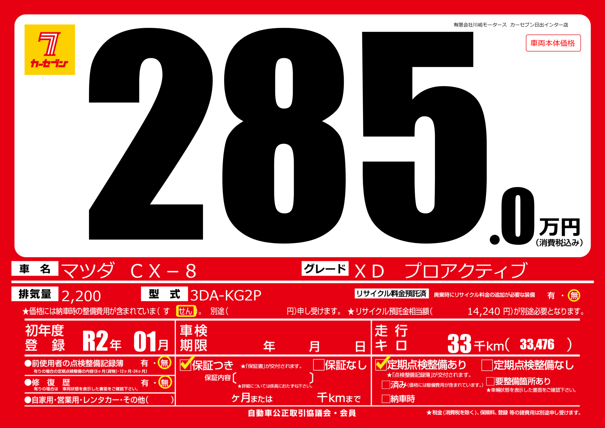 | 車名 | マツダ CX-8 | グレード ミッション 排気量 |