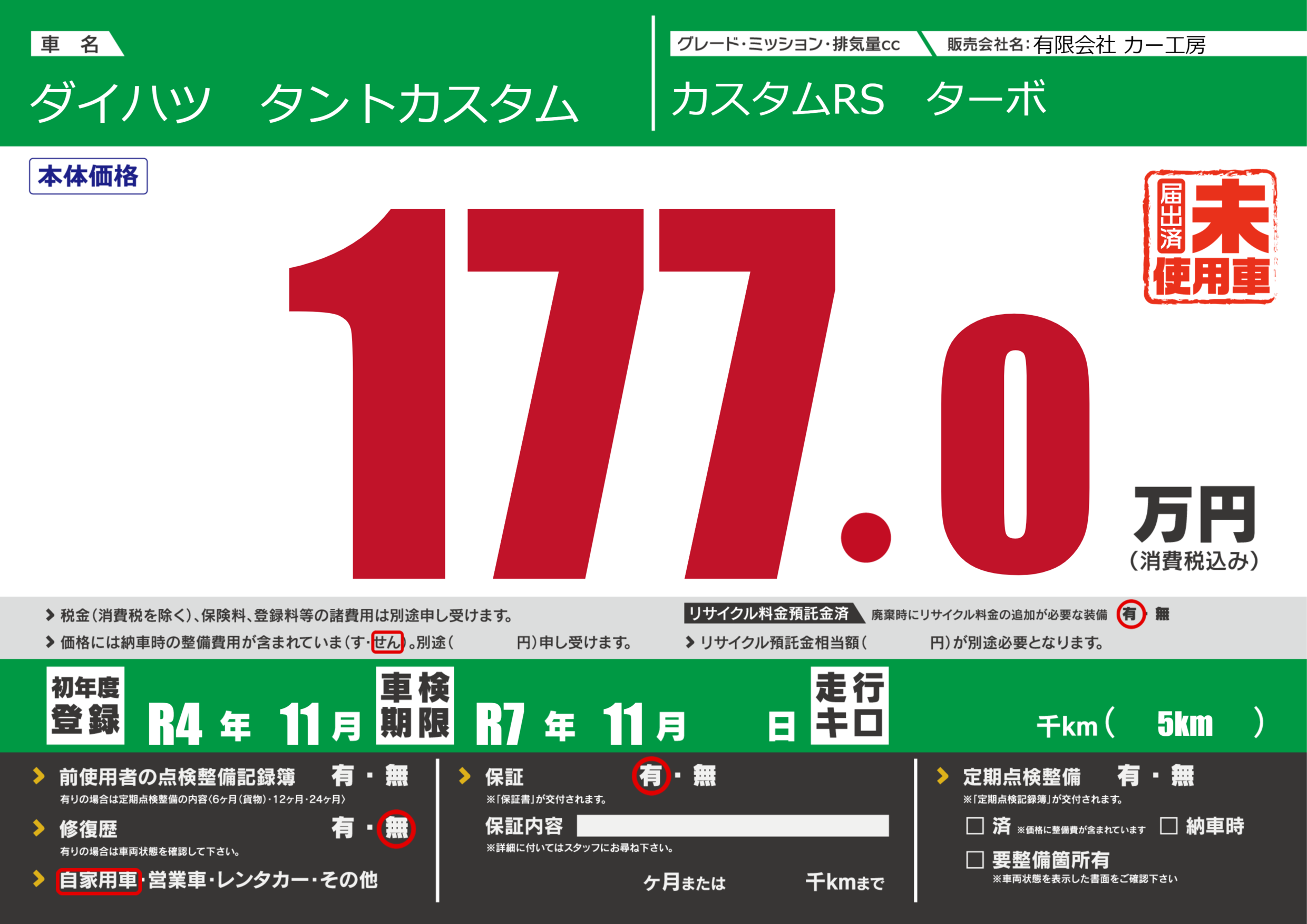| 車名 | ダイハツ タントカスタム | グレード ミッション 排気量 |