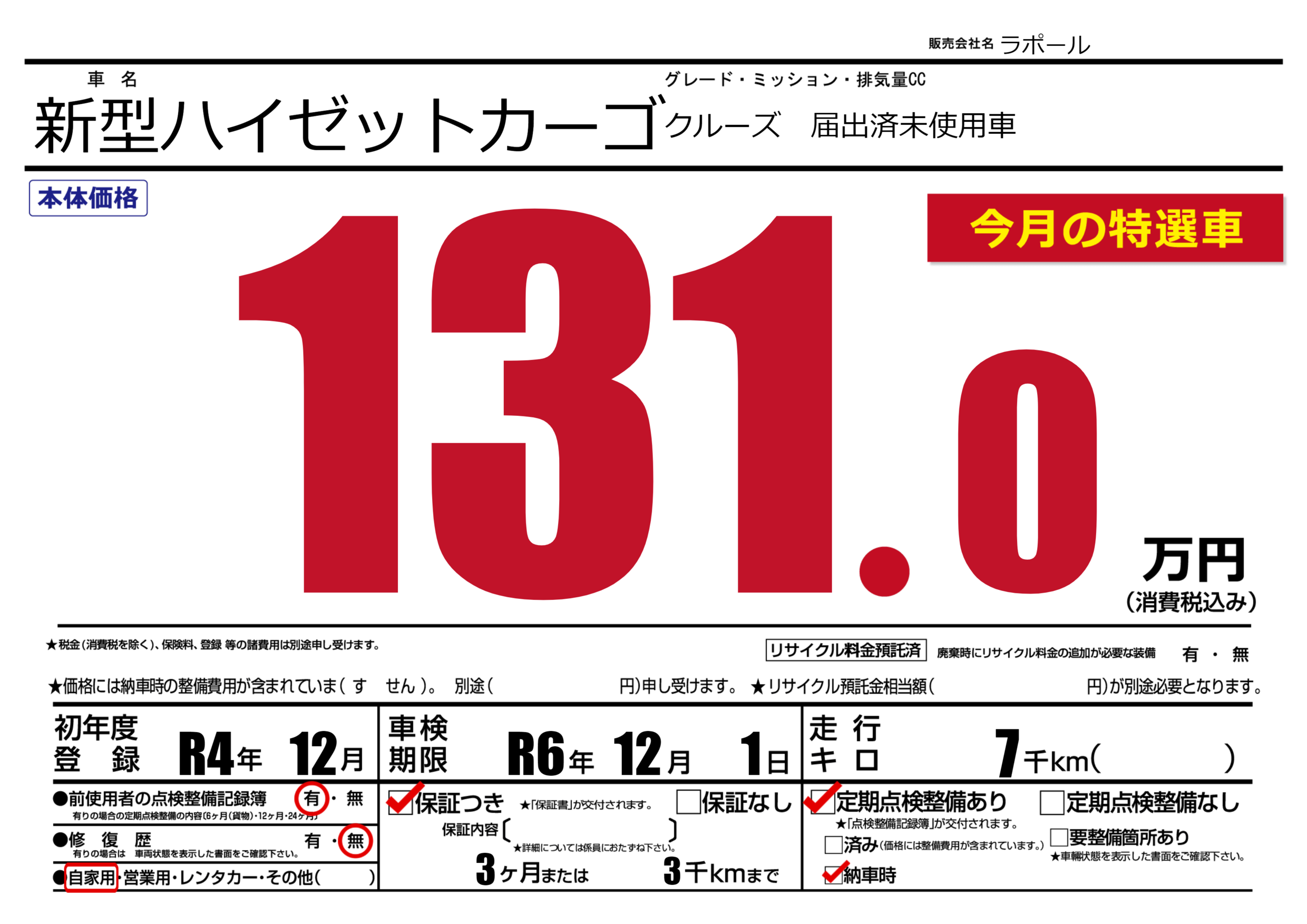 なし | 車検制限 | R6年12月1月 |
