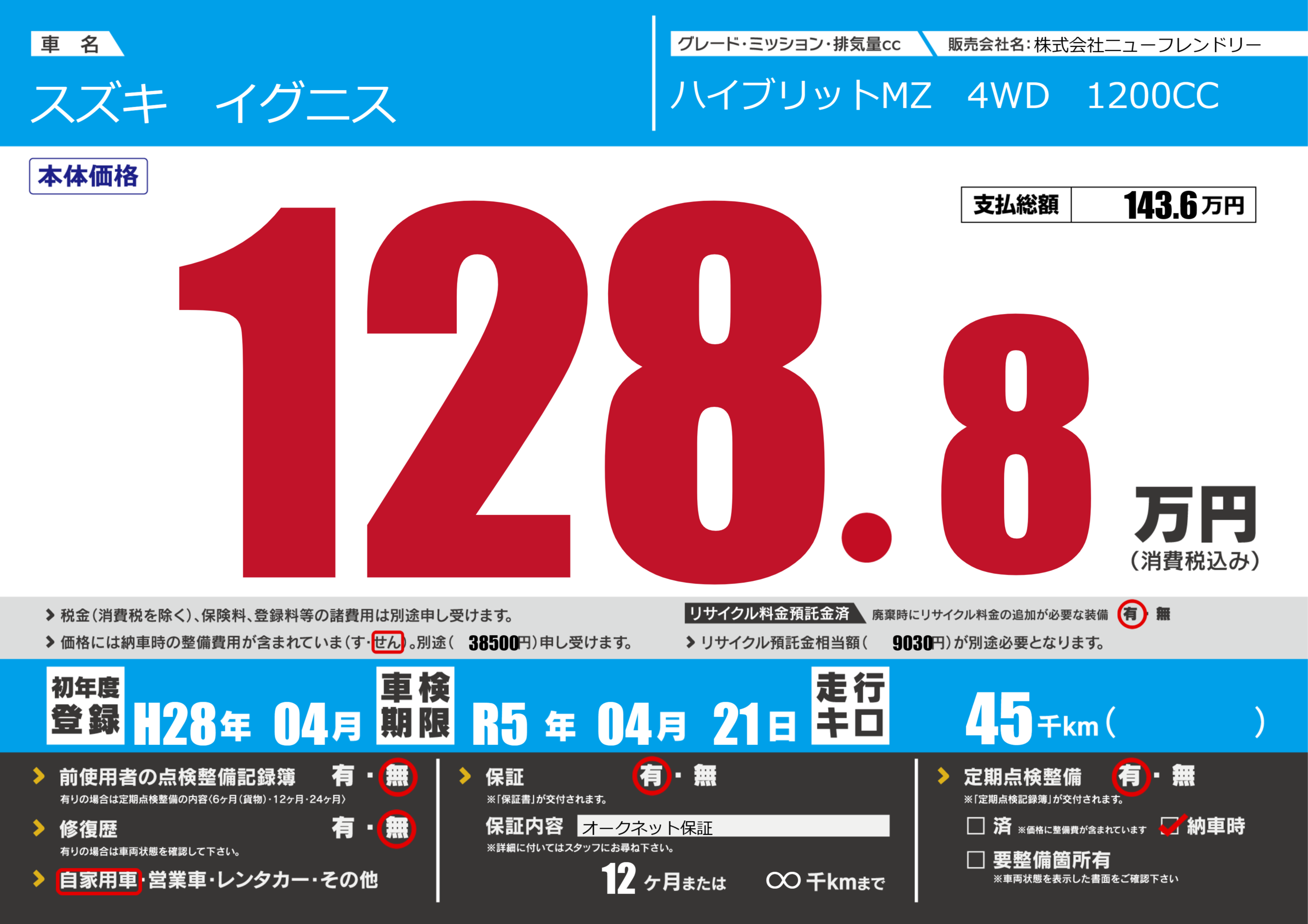 | 車名 | スズキ イグニス | グレード ミッション 排気量 |