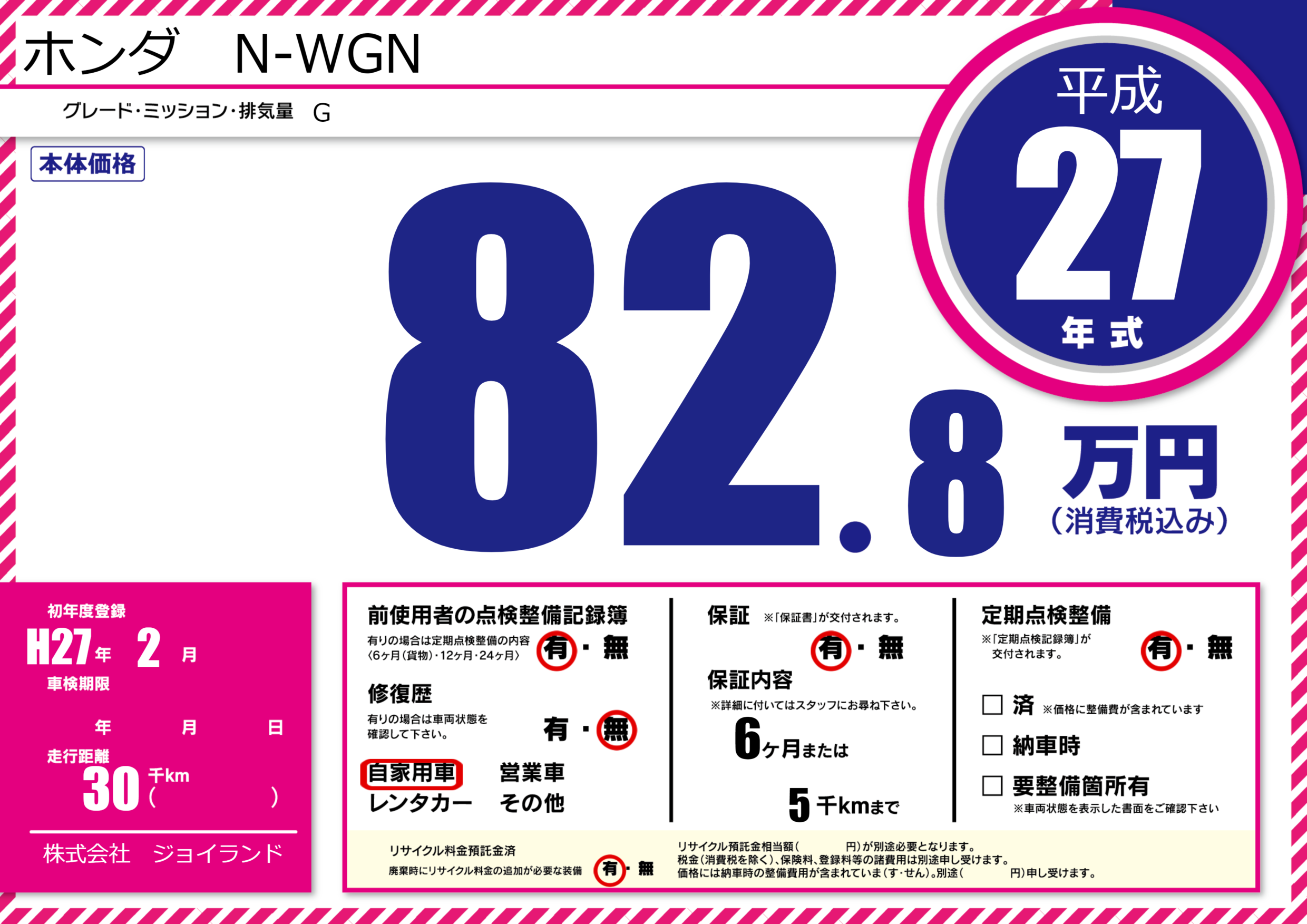 | 走行キロ | 3万km | 初年度登録 | H27年2月 |