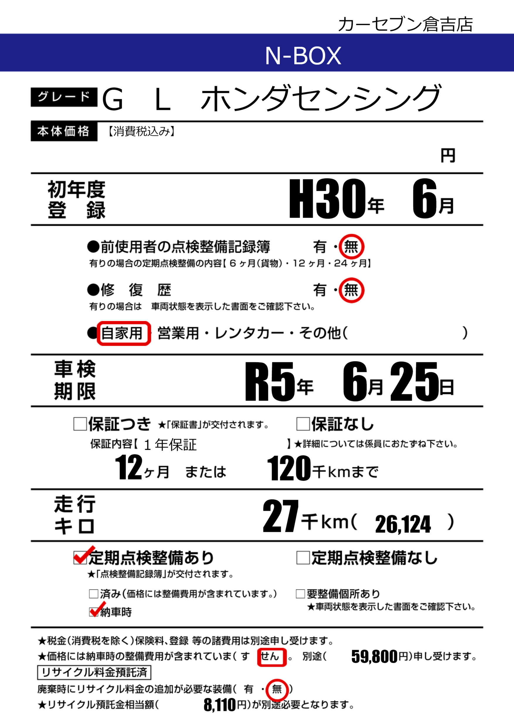 | 車名 | N-BOX | グレード ミッション 排気量 |