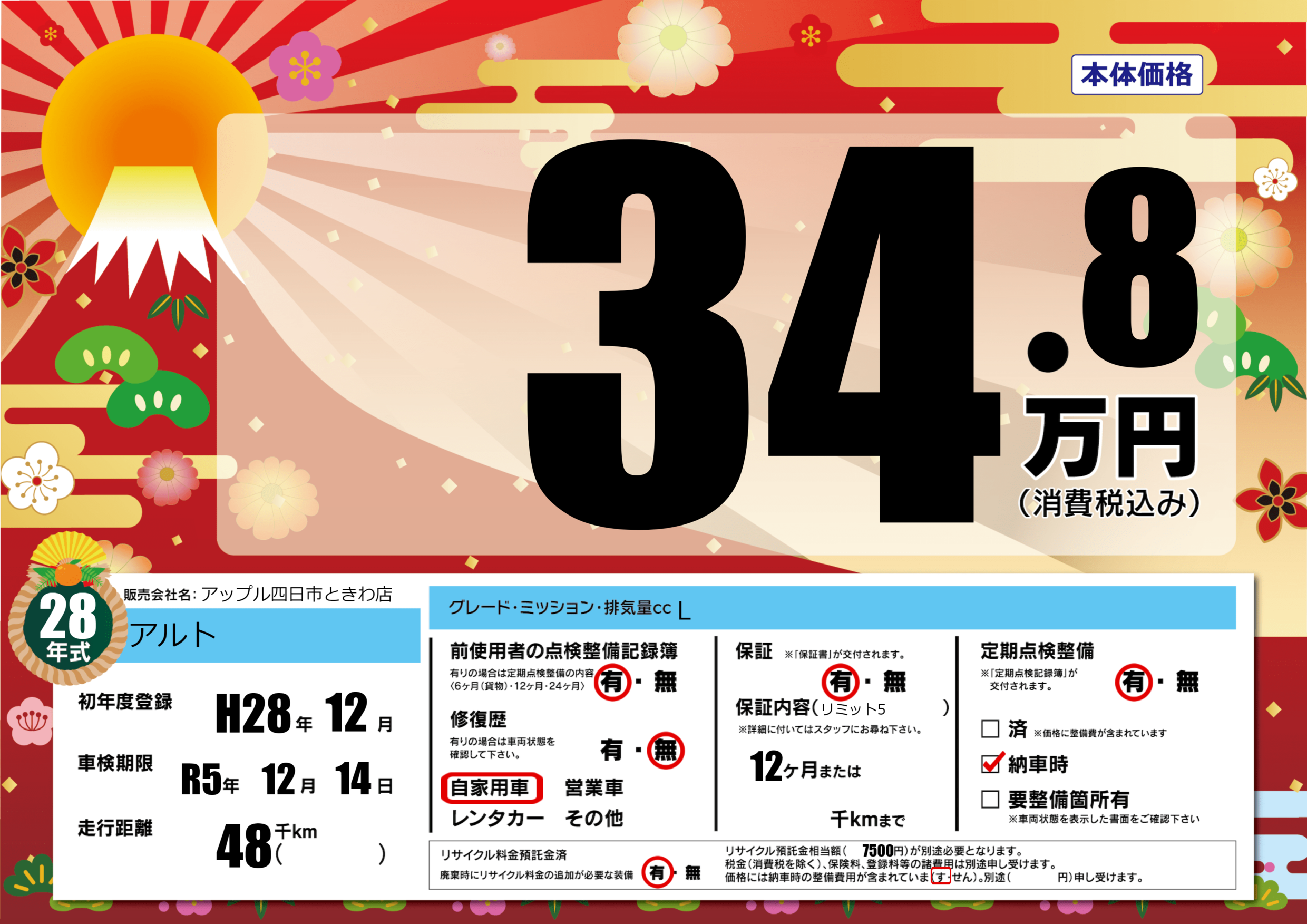 | 走行キロ | 4.8万km | 初年度登録 | H28年12月 |
