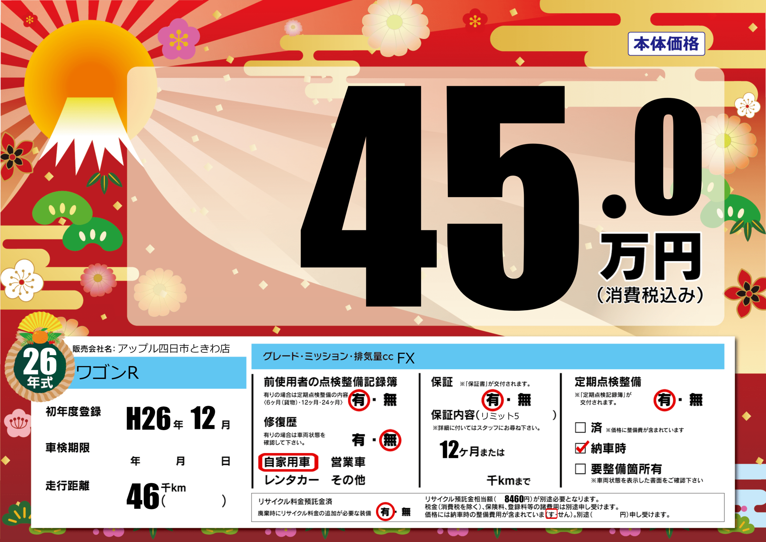 | 走行キロ | 4.6万km | 初年度登録 | H26年12月 |