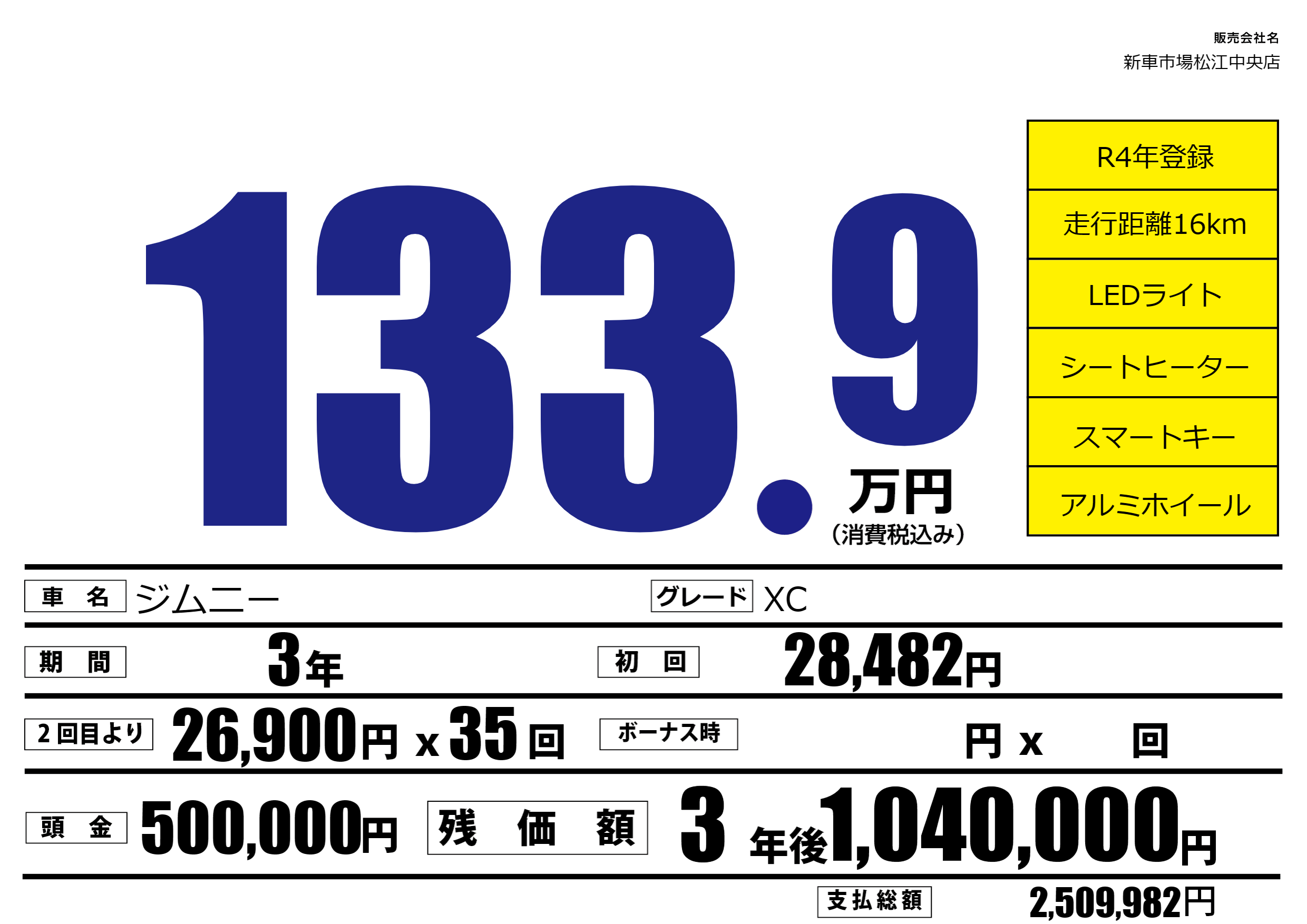 | 車名 | ジムニー | グレード ミッション 排気量 |