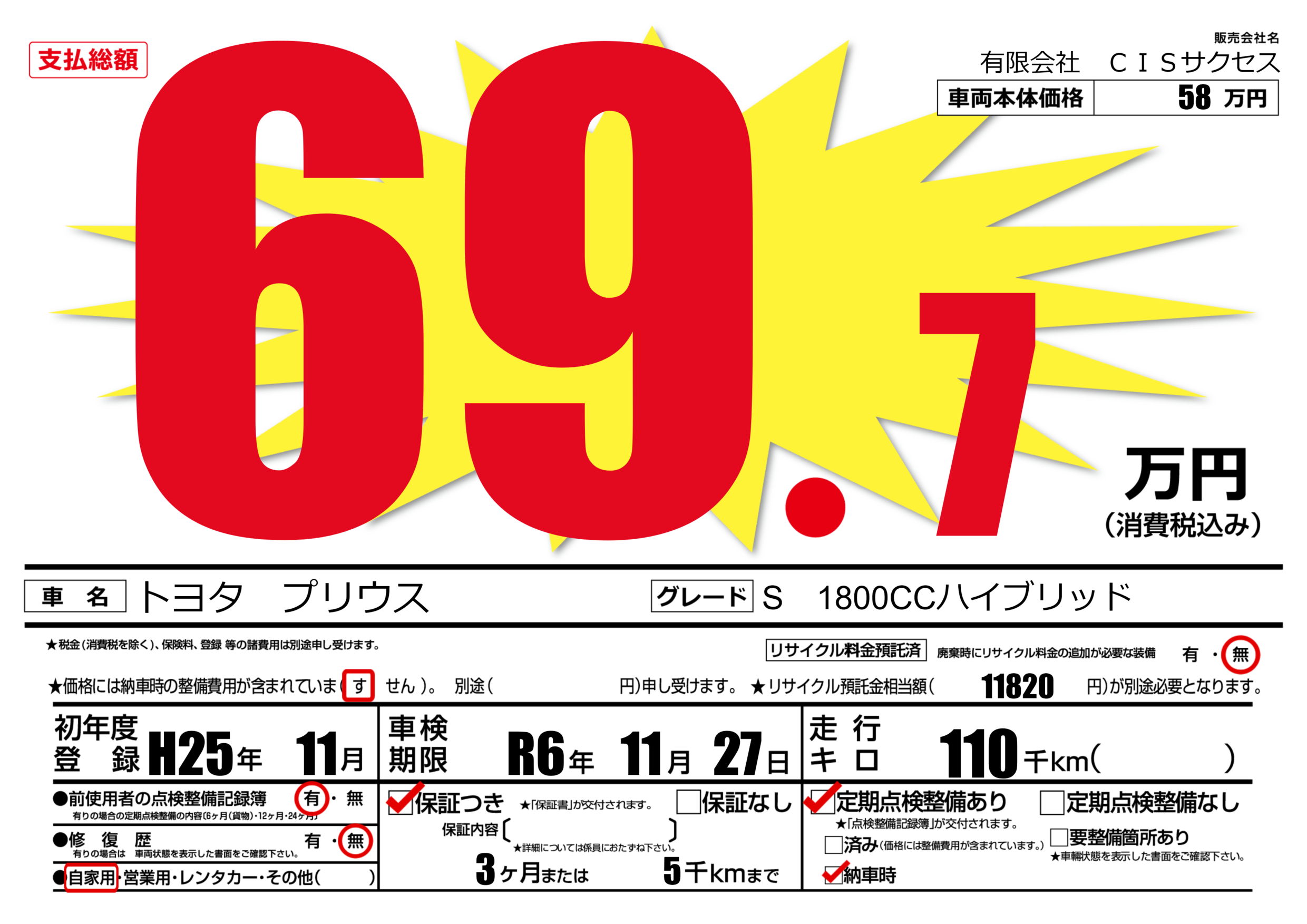 | 車検制限 | R6年 11月 27日 | ||