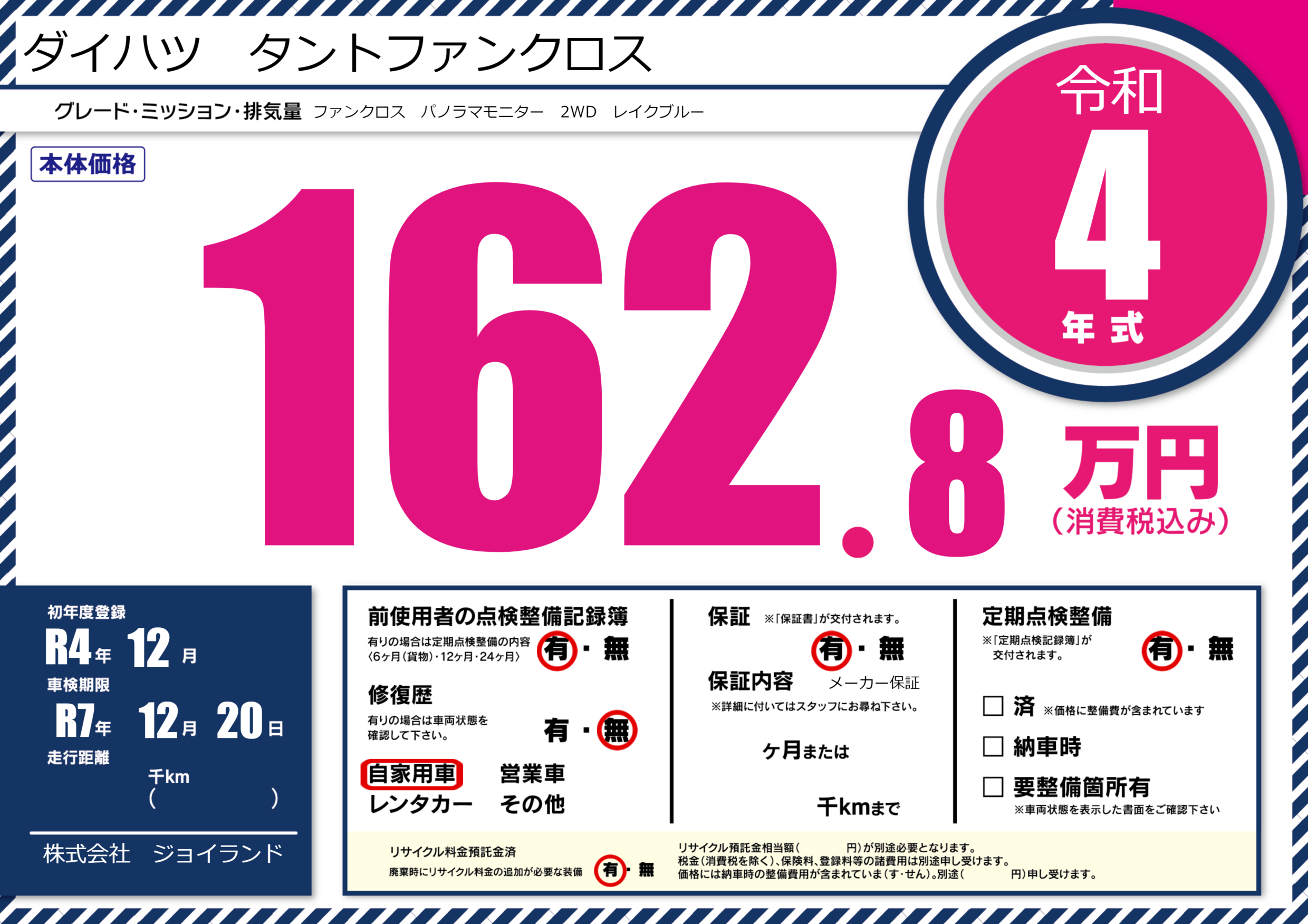 | 車名 | ダイハツ タントファンクロス | グレード ミッション 排気量 |