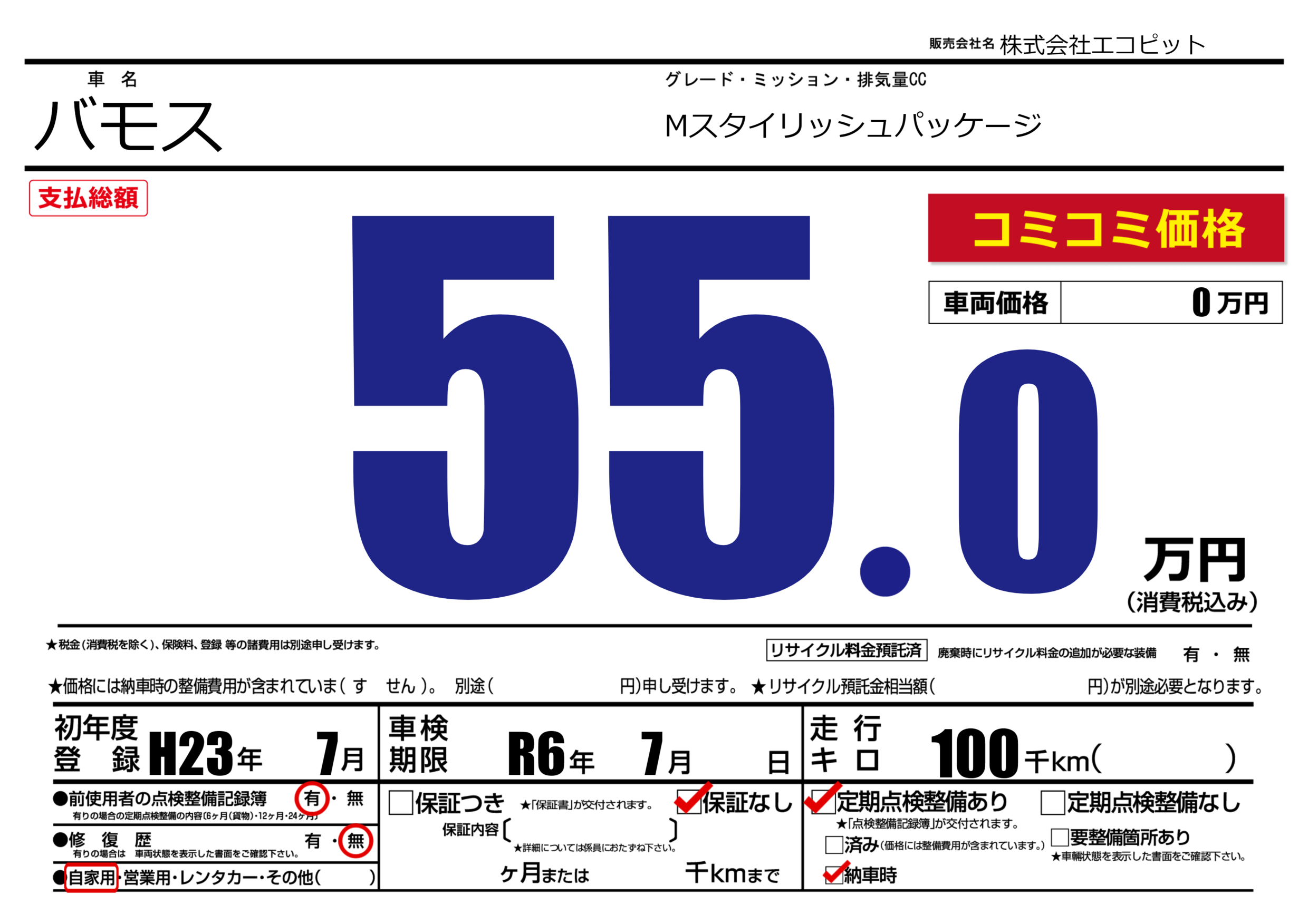 | 走行キロ | 10万km | 初年度登録 | H23年7月 |