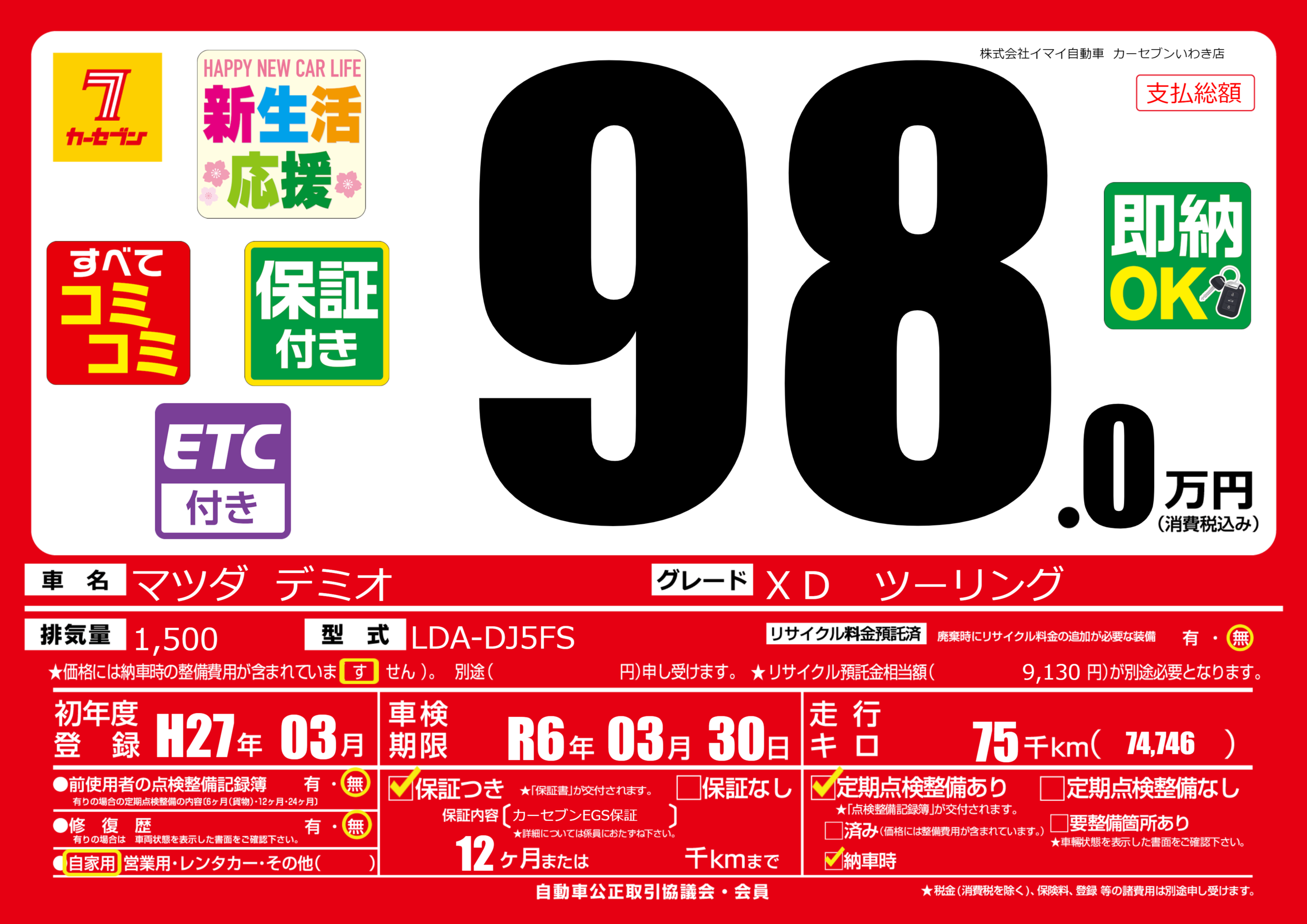| 車名 | マツダ デミオ | グレード ミッション 排気量 |