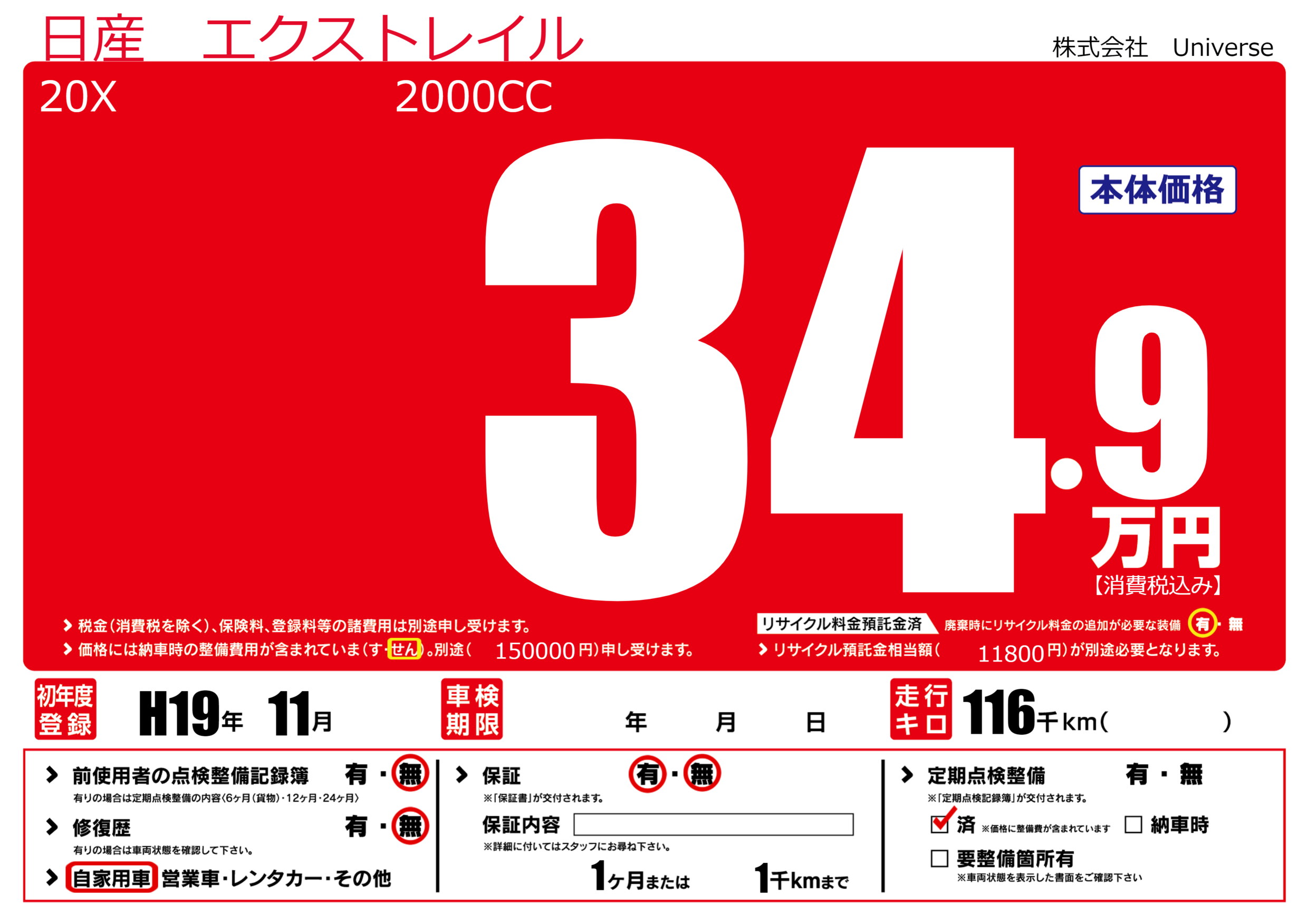 | 走行キロ | 11.6万km | 初年度登録 | H19年11月 |