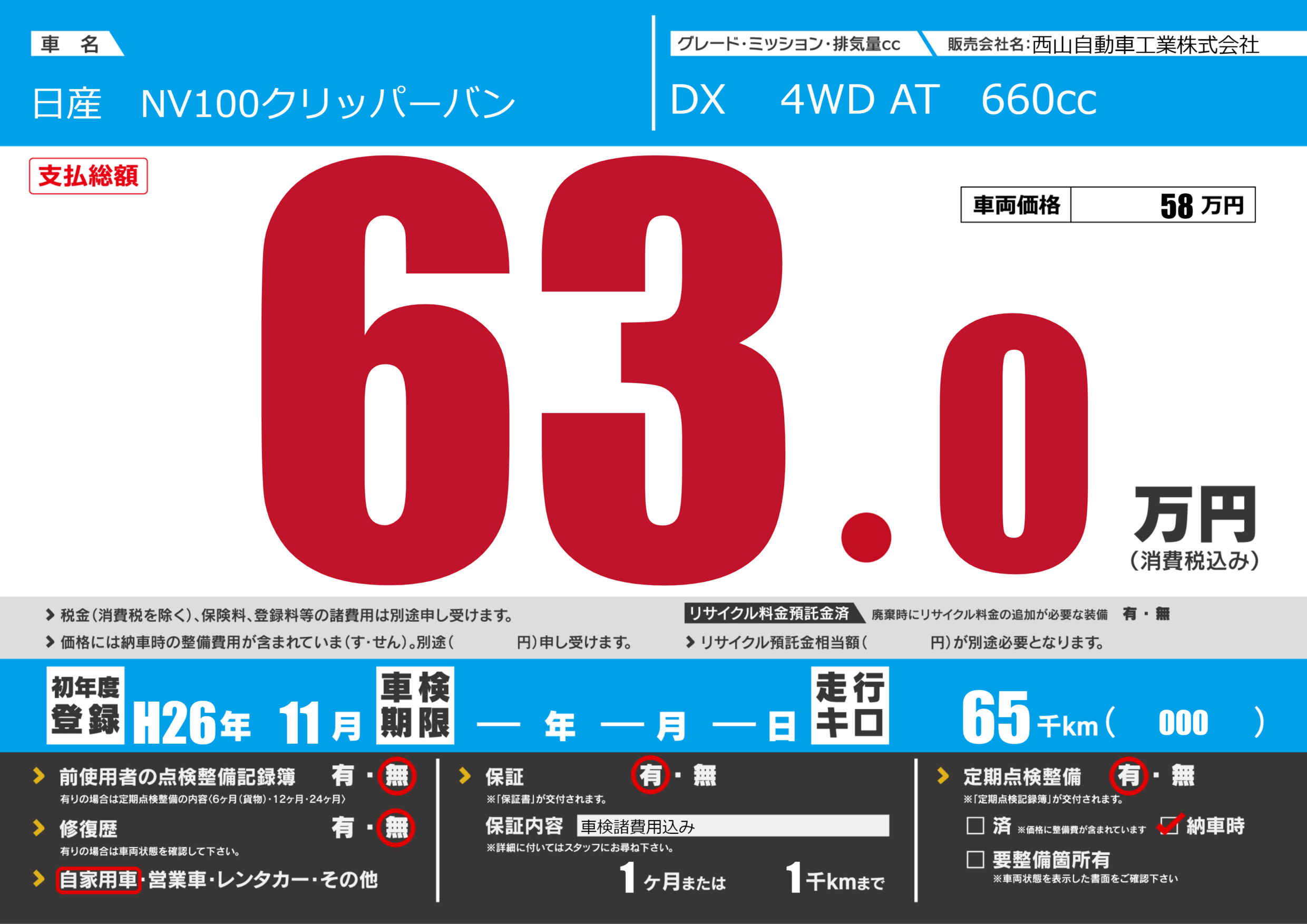保証付き 保証内容(車検諸費用込み) 1ヶ月または(1)千kmまで |