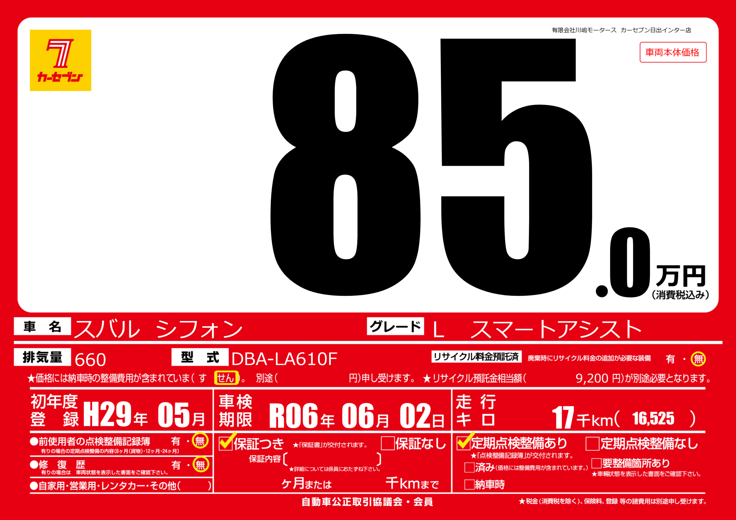 | 車名 | スバル シフォン | グレード ミッション 排気量 |