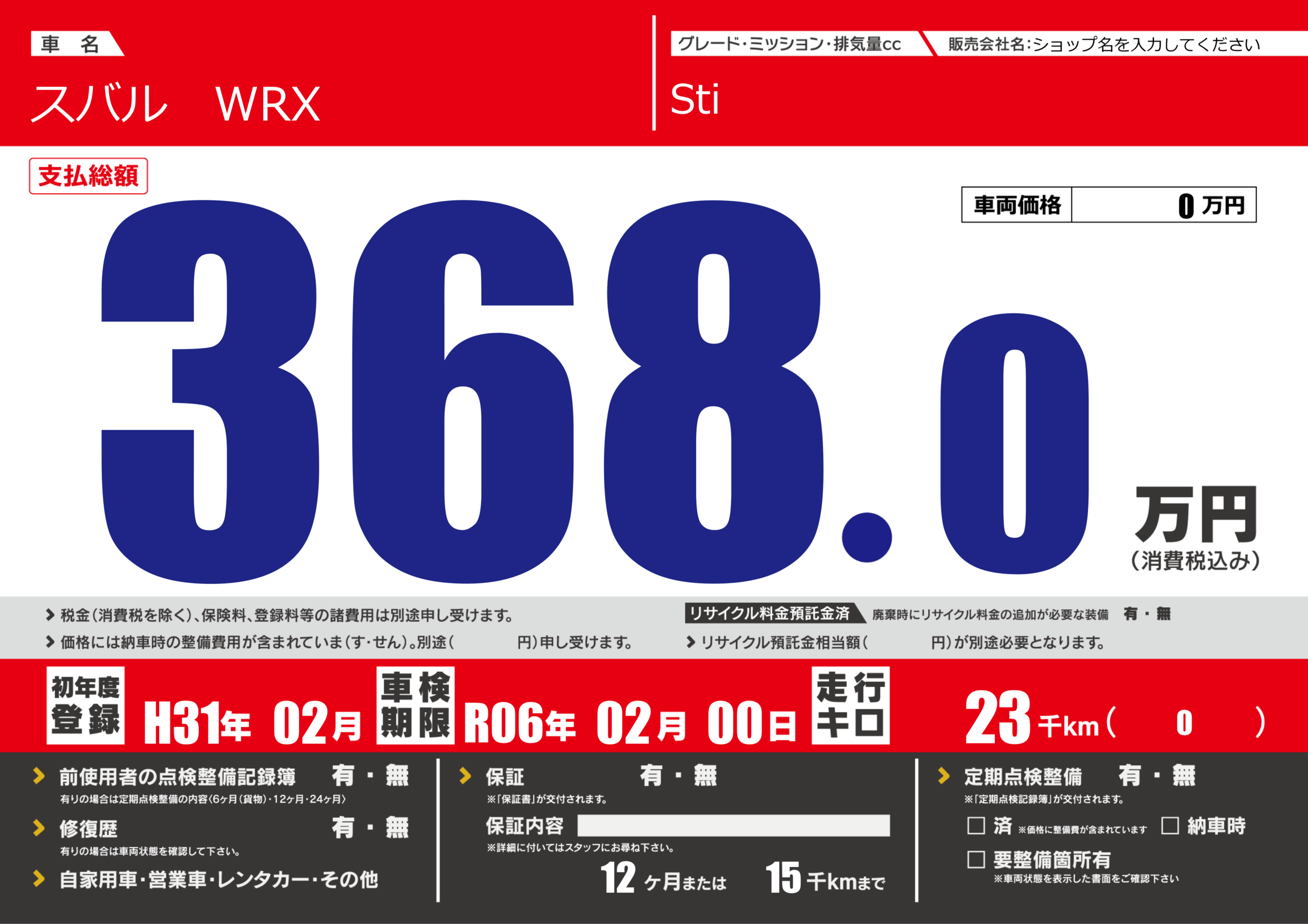 | 車名 | スバル WRX | グレード ミッション 排気量 |