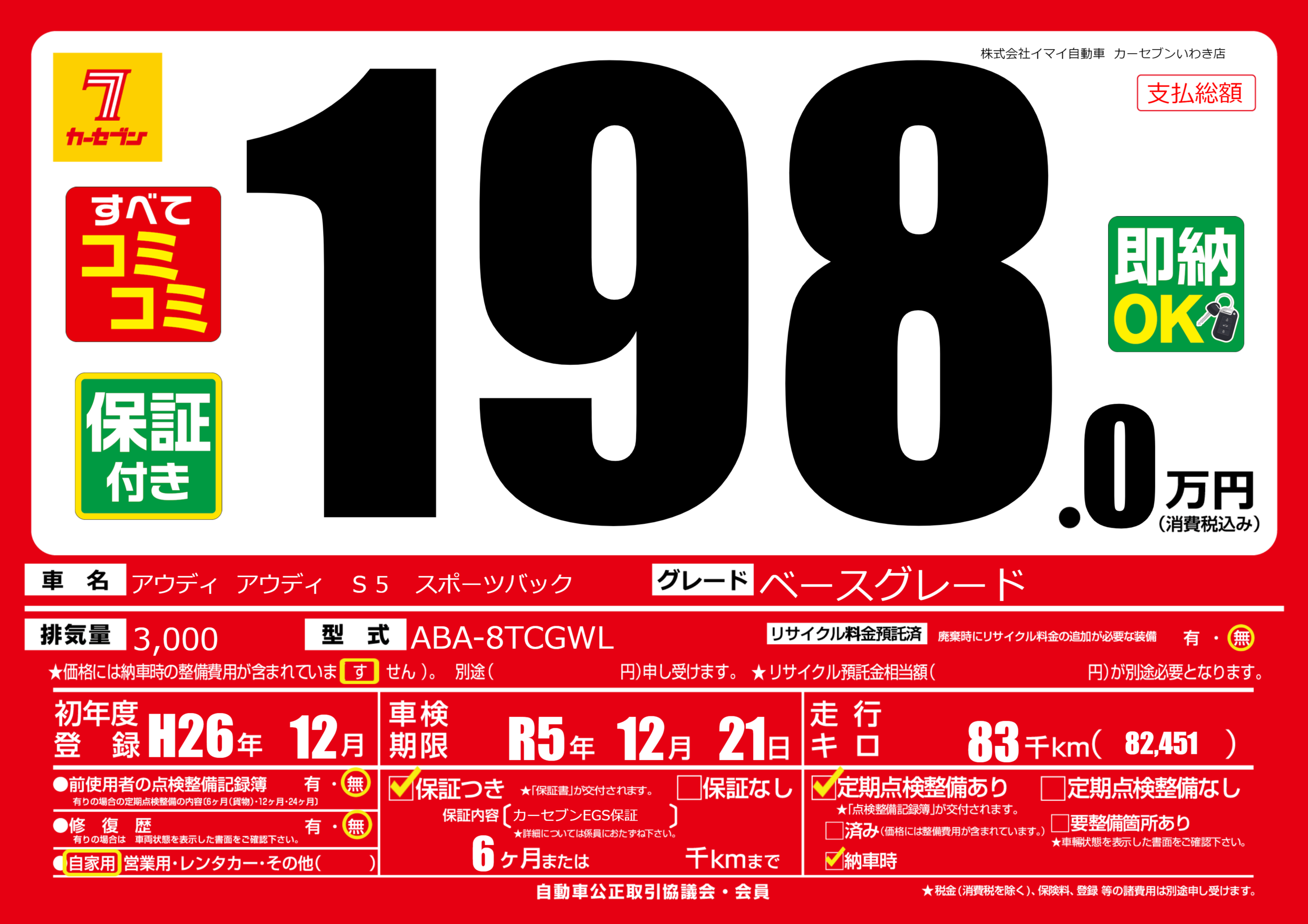 | 車名 | アウディ アウディ S5 スポーツバック | グレード ミッション 排気量 |